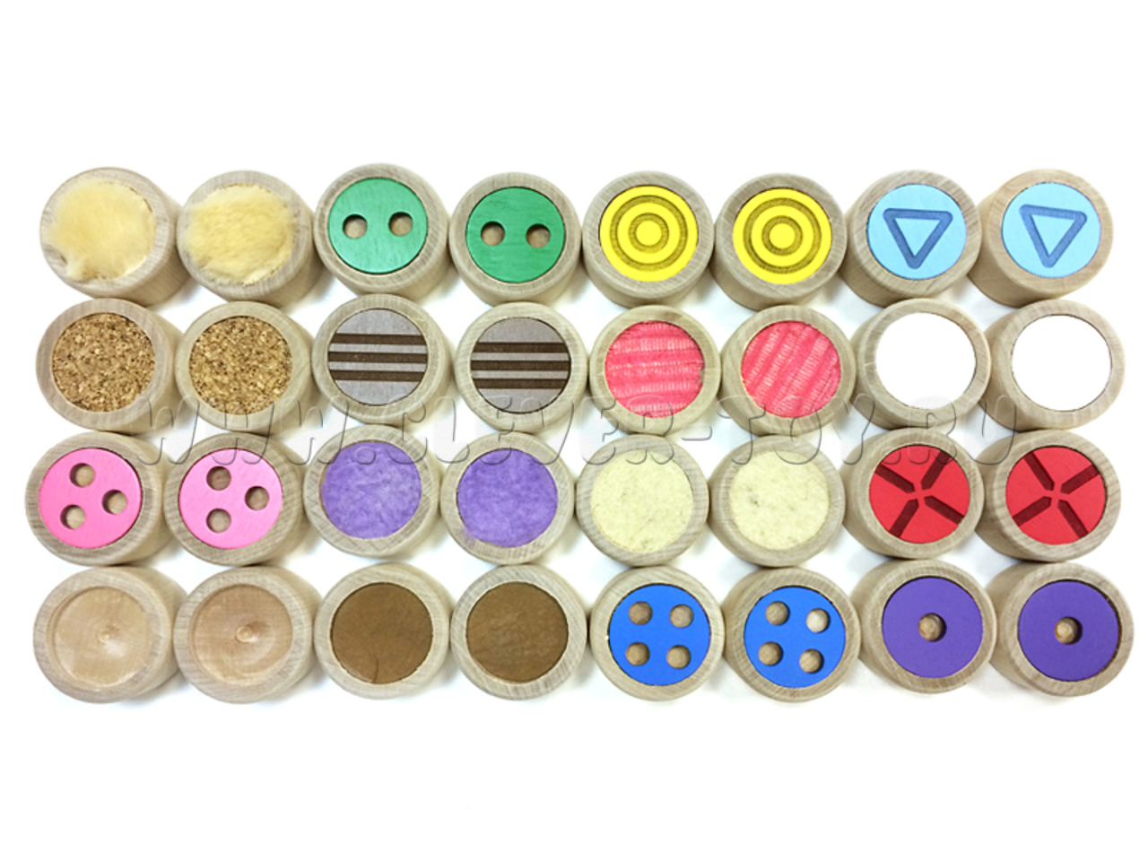 Игра для развития тактильных ощущений. Цель игры - найти на ощупь пары цилиндров с одинаковой поверхностью. В комплект входят: 32 деревянных цилиндра (16 пар), мешок.