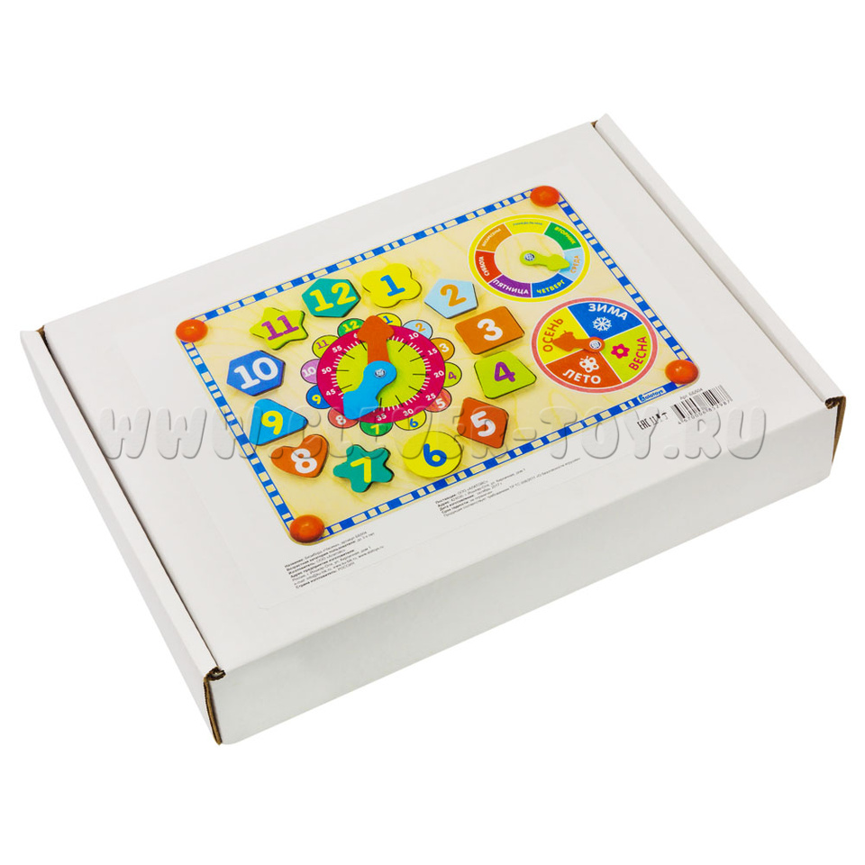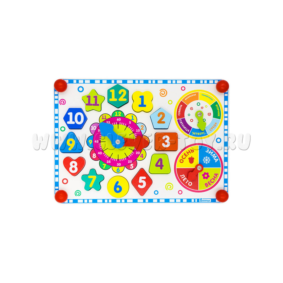 Внешний круг – с цифрами от 1 до 12 –обозначает часы, внутренний круг - с цифрами 5,10,15,20,25,30,35,40,45,50,55,60 – обучит ребёнка обозначению минут в часе. Также познакомит с секундами. В центре круга – вращающиеся стрелки (синяя маленькая – часовая, большая красная – минутная и секундная).