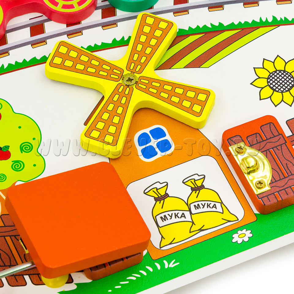 1. Деревянная основа, с изображением железной дороги, вагончиков поезда, домиком, забором, мельницы, яблони, подсолнухов.