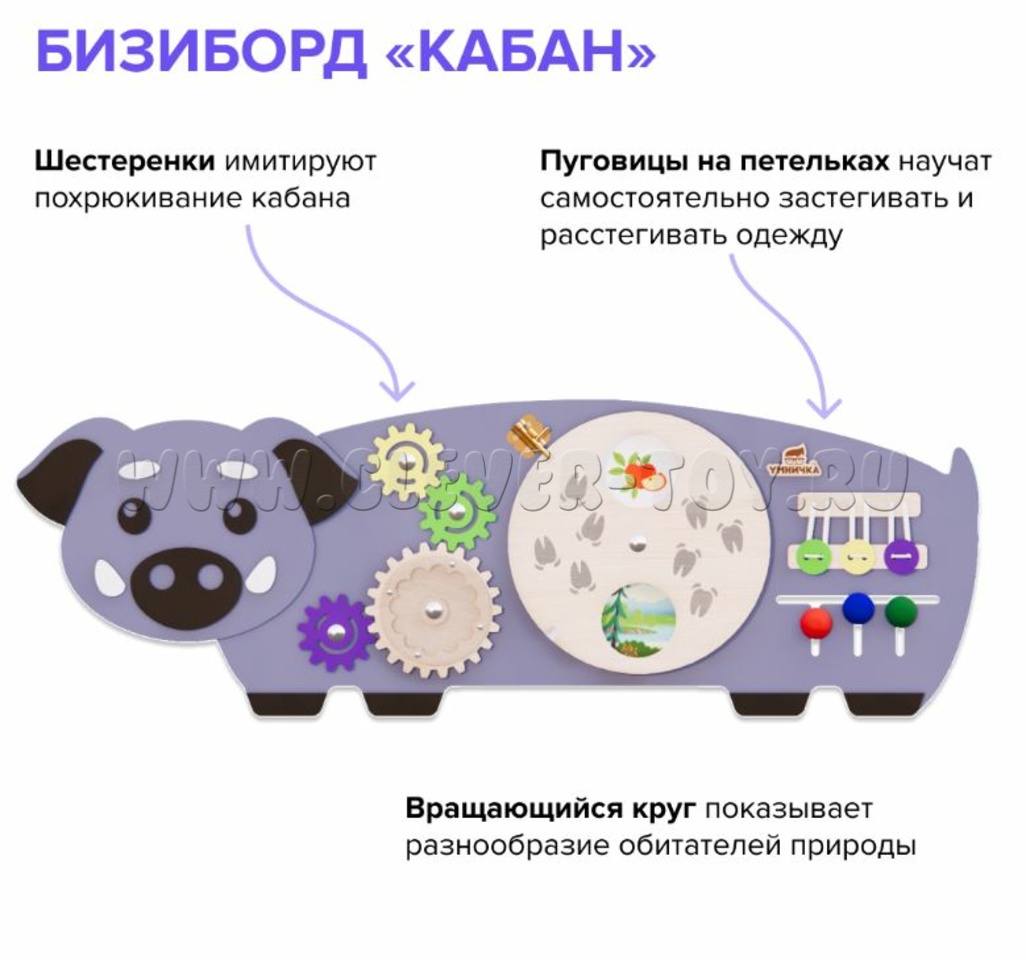 Бизиборд "Кабанчик" 2.0: Вращающаяся платформа, рассказывающая о сезонном рационе кабанчика, пуговицы и тактильные дорожки превратят занятия по окружающему миру и развитию речи в настоящее удовольствие. Дети узнают о связи между природой и животными, а также разовьют мелкую моторику, внимание и логическое мышление.