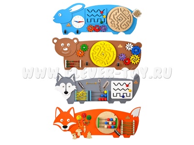 Размер бизиборда "Зайка": 88х32 см. Размер бизиборда "Мишка": 88х32 см. Размер бизиборда "Лисичка": 90х32 см. Размер бизиборда "Волчок": 88х32 см.