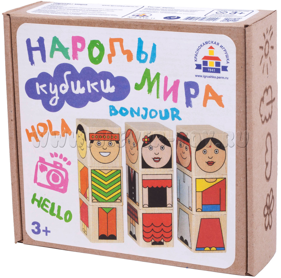 В комплект входит 9 деревянных кубиков. На 4-х гранях каждого кубика нанесена яркая картинка – часть тела забавных человечков разных национальностей. Картинки расположены таким образом, что можно ставить кубики друг на друга, чтобы получался вертикальный «кубический человечек».