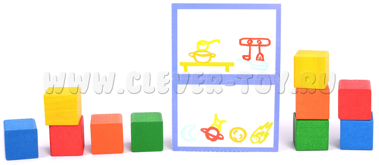Правила. Игроки расставляют кубики по соответствующим цветам элементов на карточке с заданием. Кто первым это сделает - забирает картинку. Победителем окажется обладатель наибольшего количества карточек.