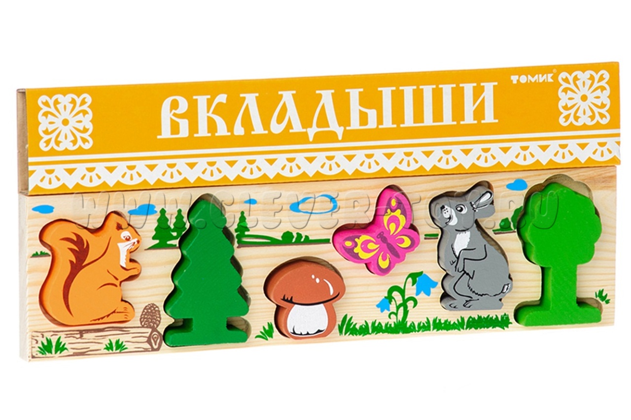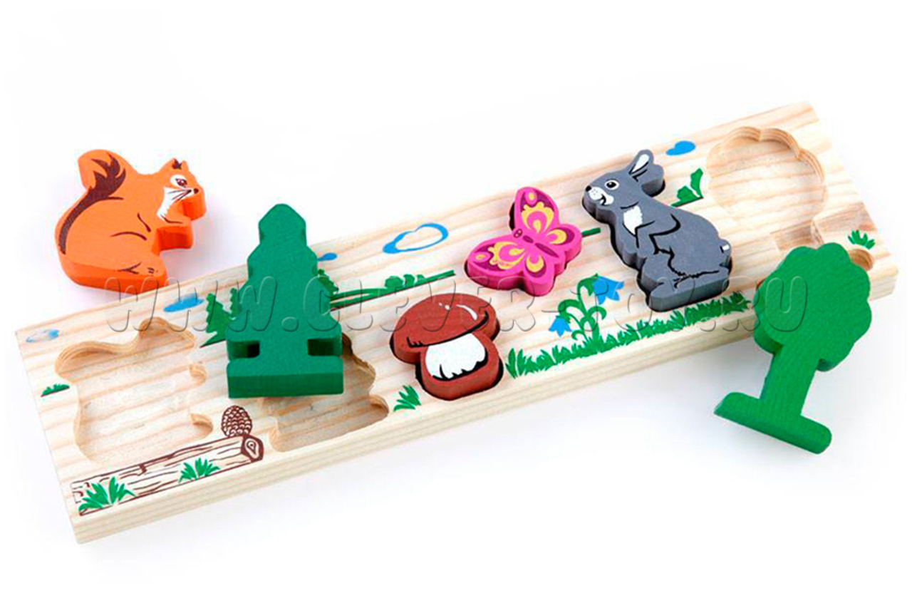 Деревянная рамка-Вкладыш "Лес" состоит из 6 фигурок животных и рамки, в подходящие по форме отверстия которой нужно установить соответствующие детали.