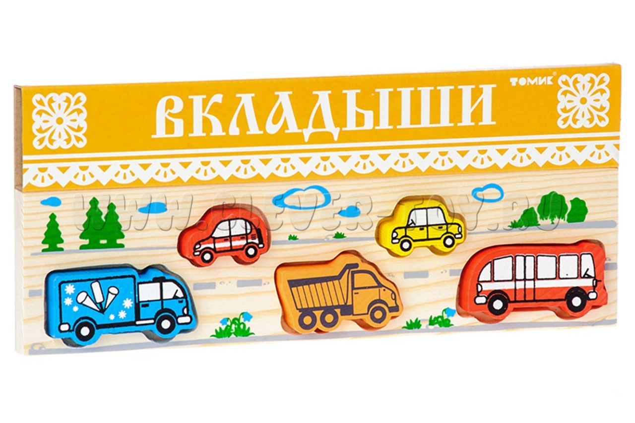 Деревянная рамка-Вкладыш "Транспорт" состоит из 5 фигурок автомобилей (легковых и грузовых) и рамки, в подходящие по форме отверстия которой нужно установить соответствующие детали.