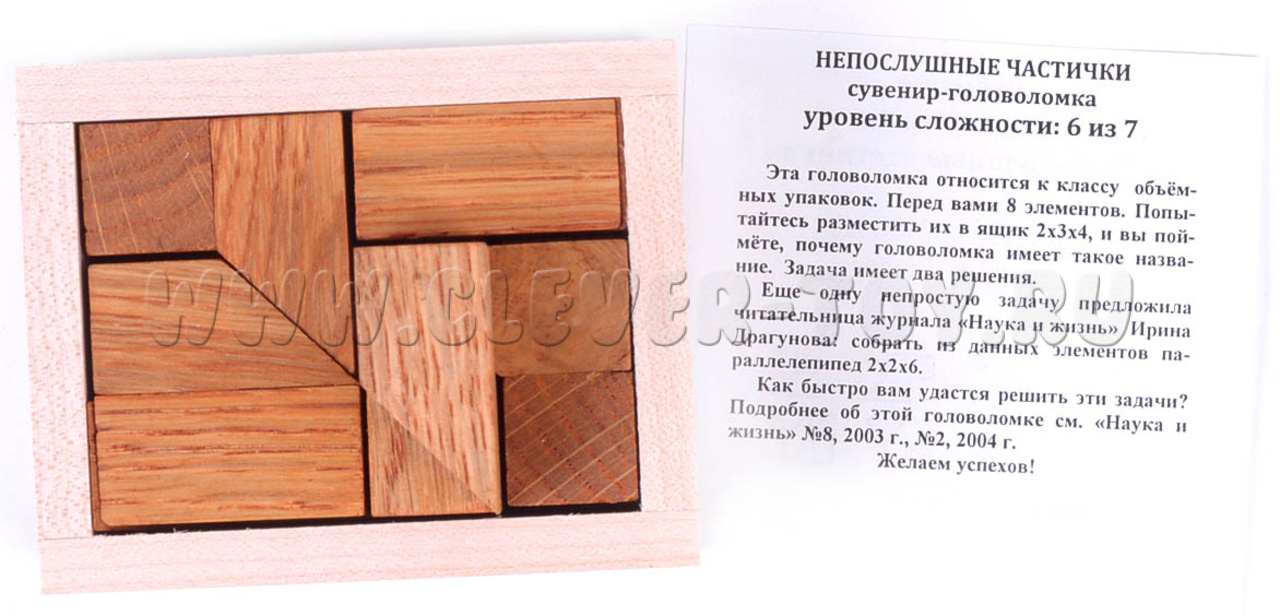 Головоломка "Непослушные частички" - это увлекательная игра, представляющая собой набор небольших частей, которые должны быть собраны в определенном порядке или конфигурации для того чтобы упаковать их в ящике. Не должно остаться торчащих частей.