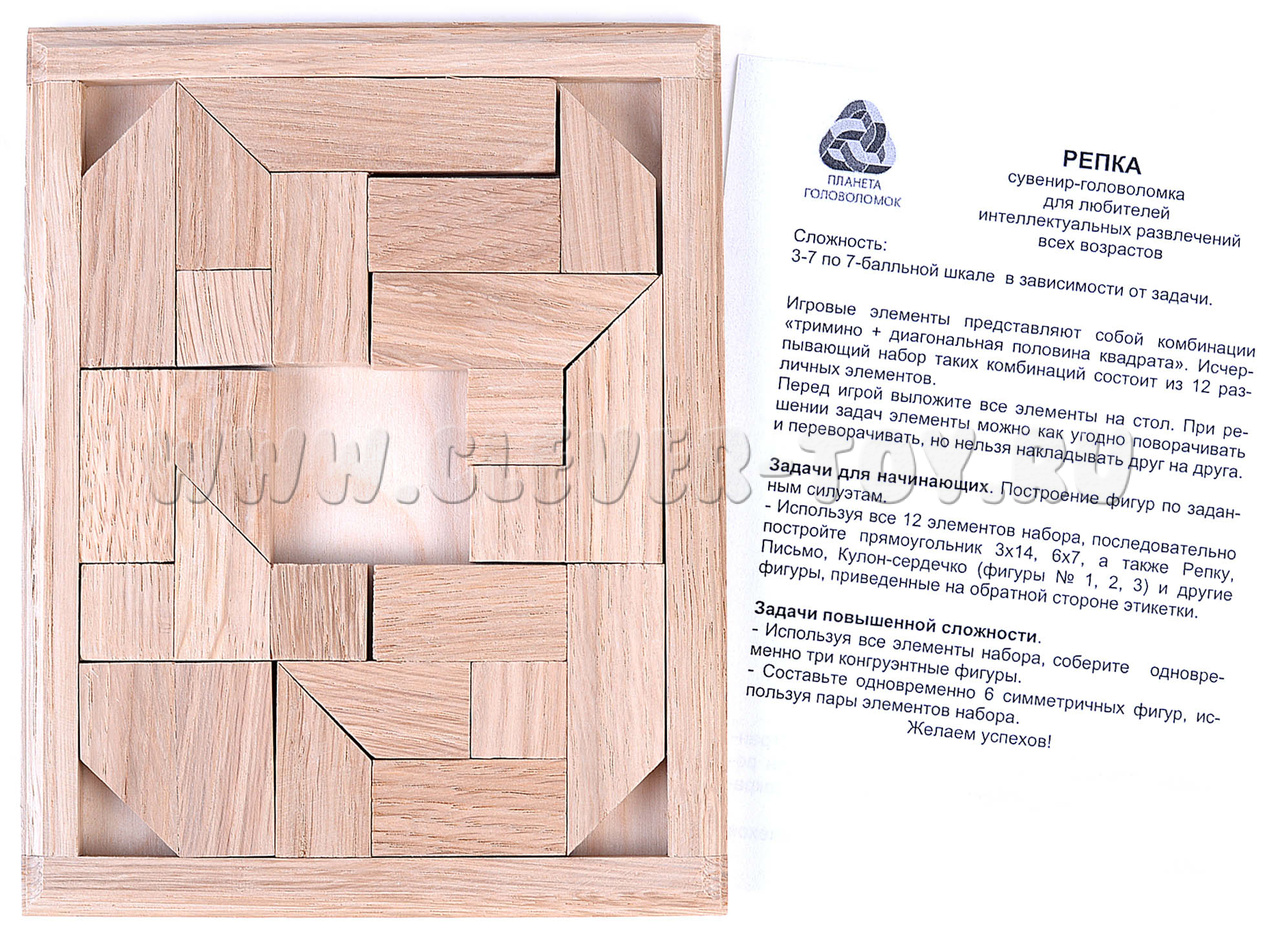Головоломка "Репка" включает в себя игровую доску и 24 элемента разной формы. Задача заключается в сборке фигур разной формы по примеру. Задания подразделяются на две категории (для начинающих и повышенной сложности).
