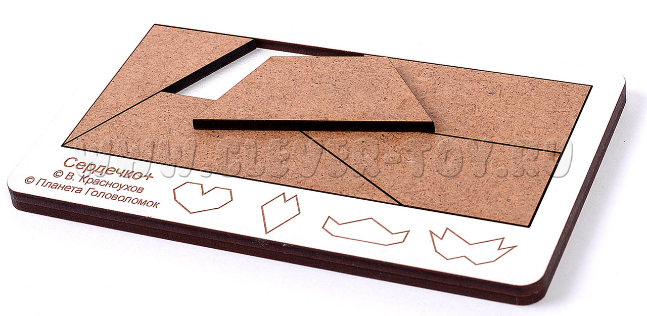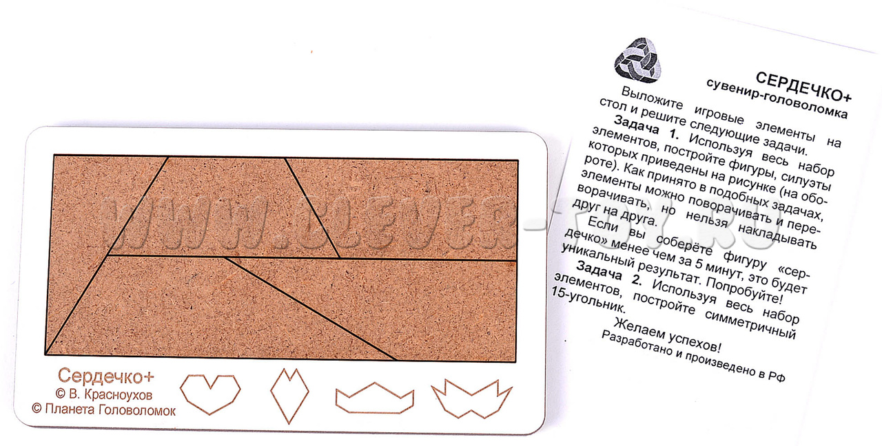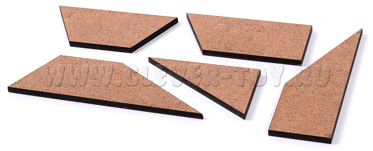 Всего 5 элементов и 5 заданий. Сначала соберите 4 фигуры, представленные на передней стороне головоломки. Следующий этап сложнее. Соберите симметричный 15-ти угольник.