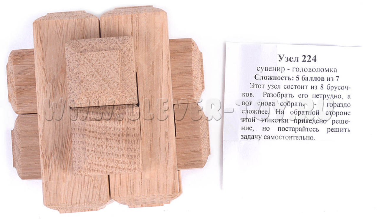 Относится к типу головоломок "узлы", что означает, что головоломка «Узел 224» в собранном виде из деревянных брусочков сама не распадется на составляющие ее элементы. Рабочие элементы достаточно крепко сцеплены между собой. Увлекательным процесс начинает быть после того, как Вы разобрали эту головоломку. Ведь теперь Вам предстоит её собрать. Причем и сборка, и разборка узла потребует от вас не один час и порой не один вечер.