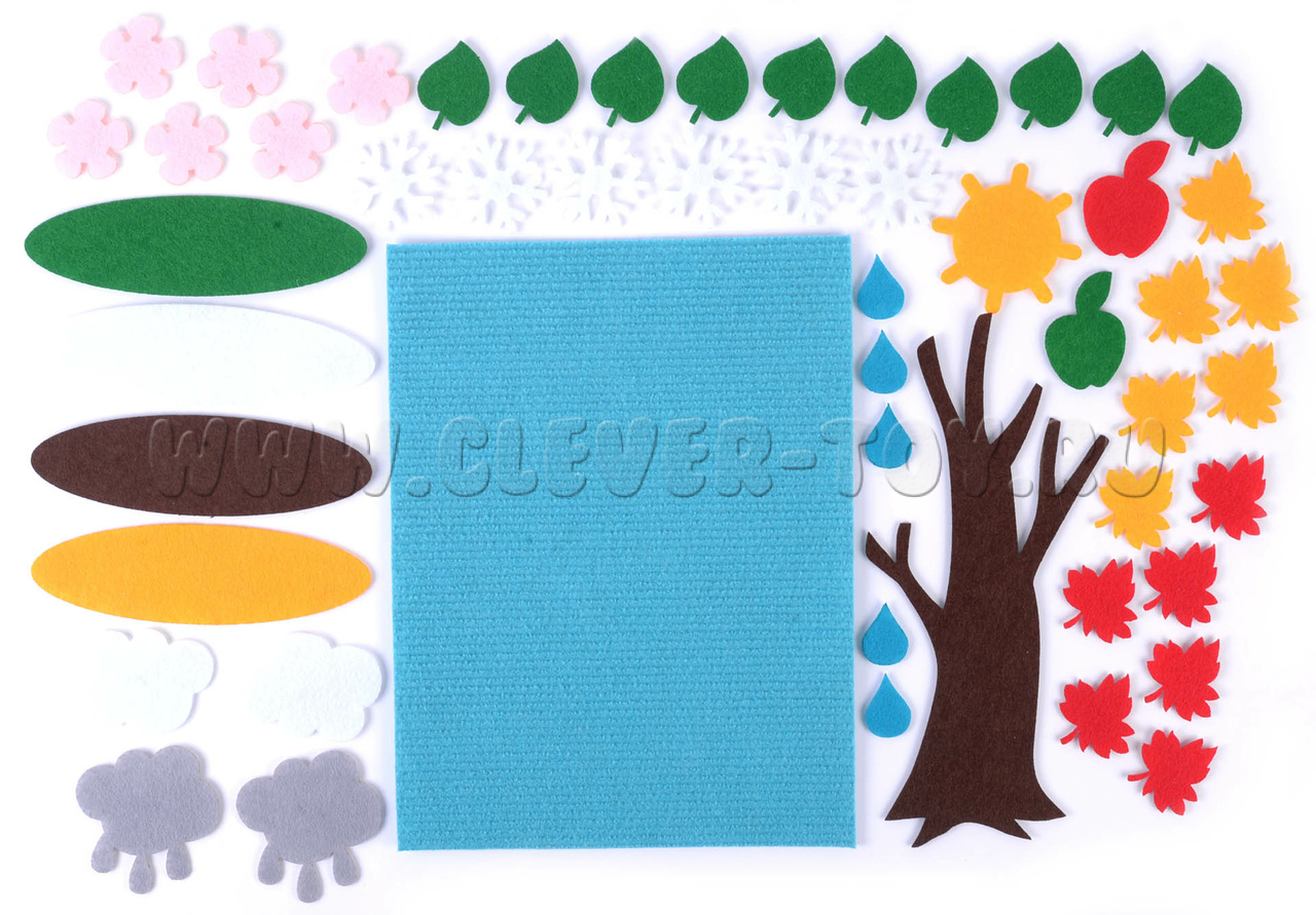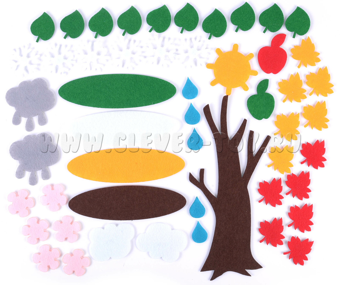 • Набор из 49 фигурок (яблочки, листья, цветы, облака, снежинки, ствол дерева, земля, капли и др.),