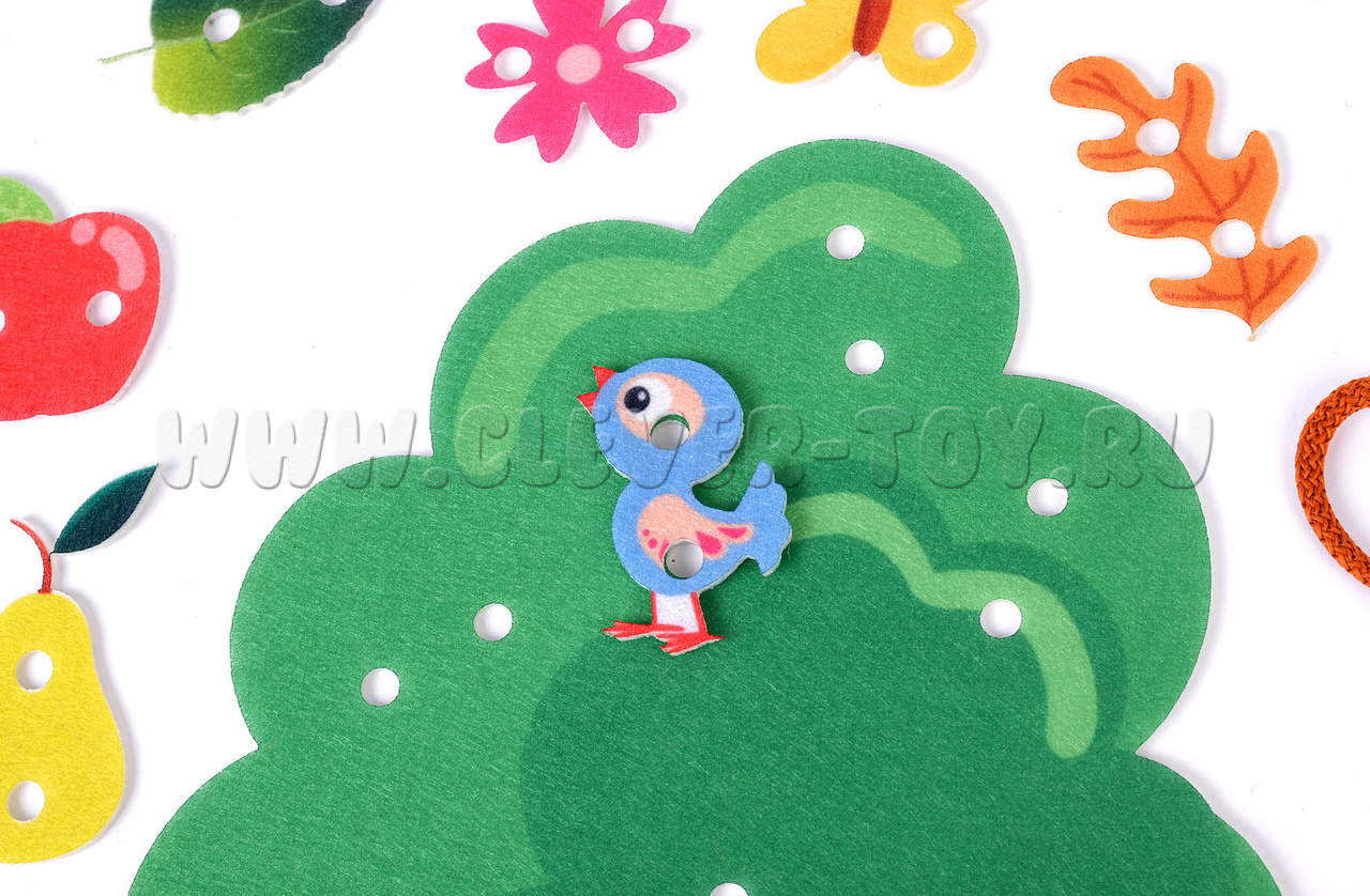 • 8 игровых элементов из фетра – яблоко, груша, бабочка, дубовый листочек, берёзовый листочек, цветочек, птичка;