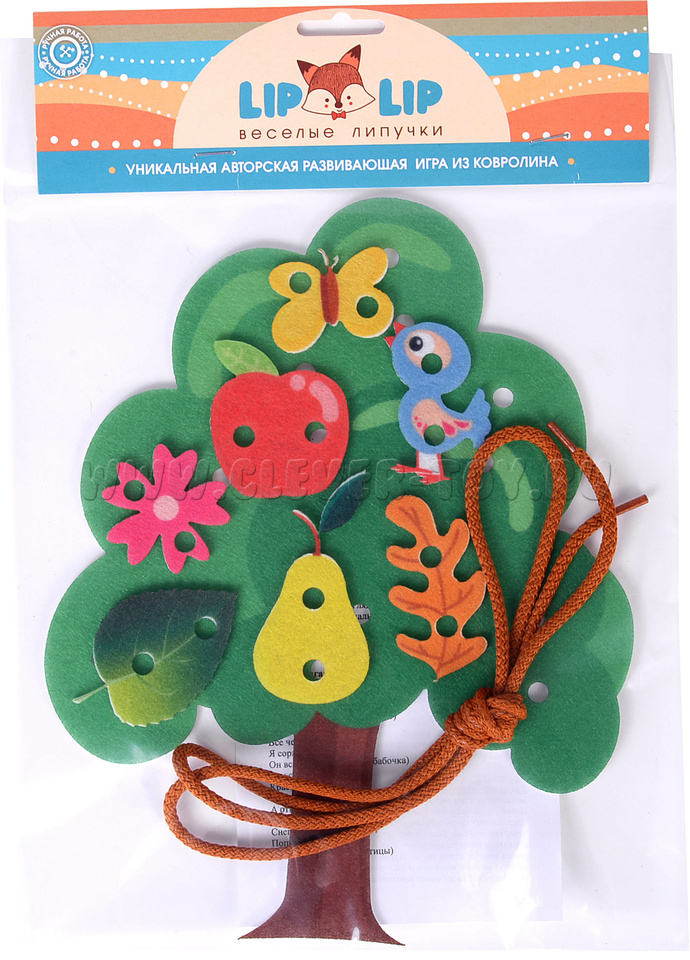 В набор также входит инструкция для педагогов и родителей с вариантами различных игр и занятий с детьми младшего и среднего дошкольного возраста. Например, игра «Фруктики, листочки» для самых маленьких: предложите малышу найти все фрукты, которые могут созреть на дереве, пусть ребёнок закрепит их с помощью шнурка. С детьми более старшего возраста можно придумывать сказочные истории и «оживлять» их с помощью игровых элементов набора.