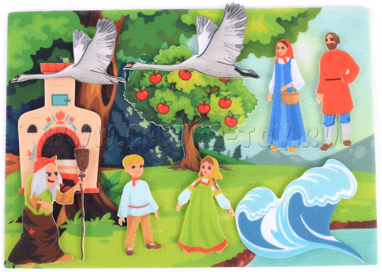 Детское игровое пособие познакомит ребенка со сказкой "Гуси лебеди". Выполнено из фетра по типу кукольного театра и подойдет для театральных, дидактических и сюжетных игр. Фигурки легко прилипают и отлипают, не мнутся и не рвутся в процессе игры.