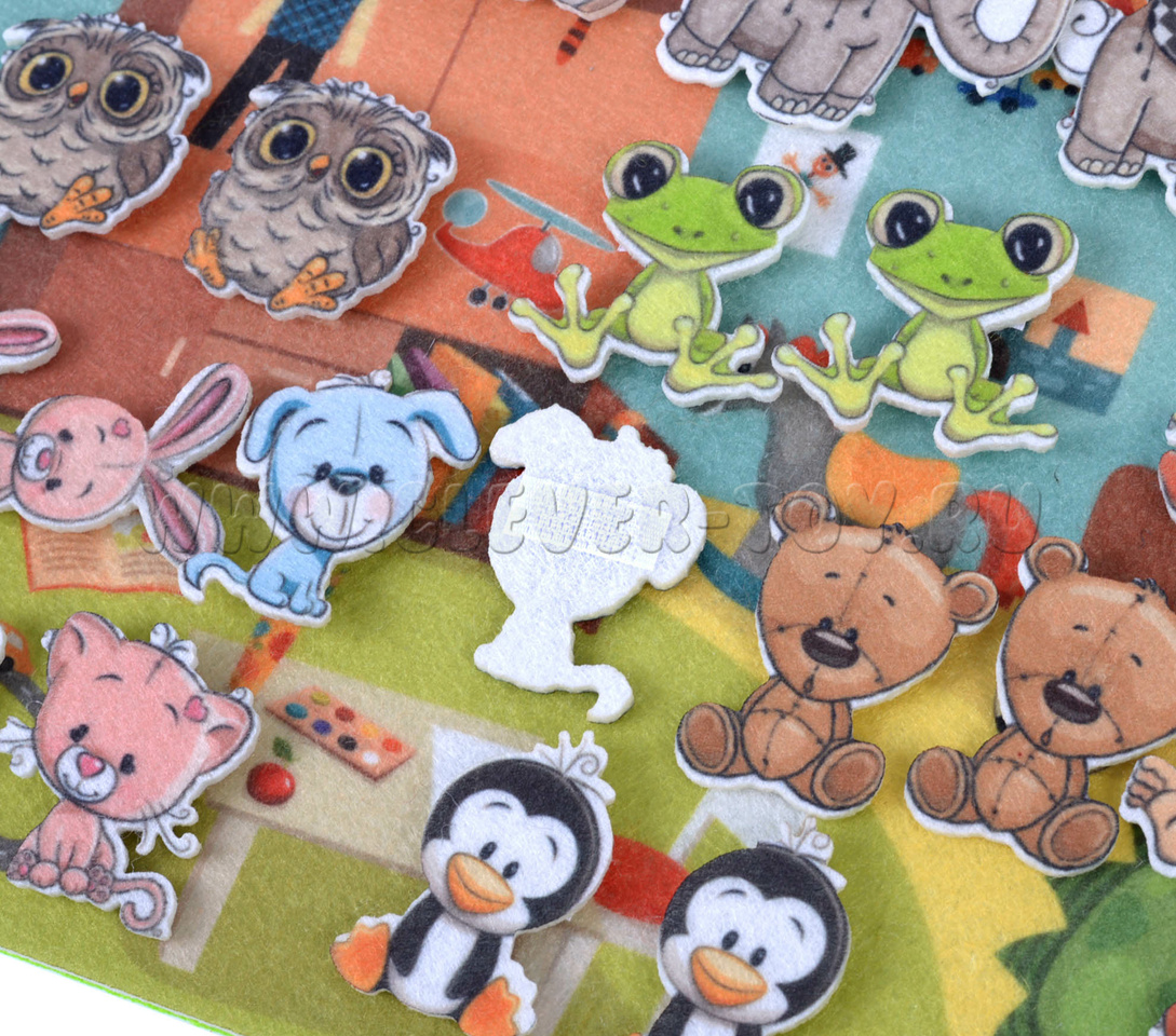 Фетровый конструктор с забавными игрушками на многоразовых липучках и тематическим игровым полем в виде конверта, где удобно хранить игровые элементы.
