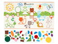 В наборе ковер из фетра (48*84 см), 42 геометрические фигуры на липучках, 2 листа карточек для вырезания, 2 планшета из 9 клеток.