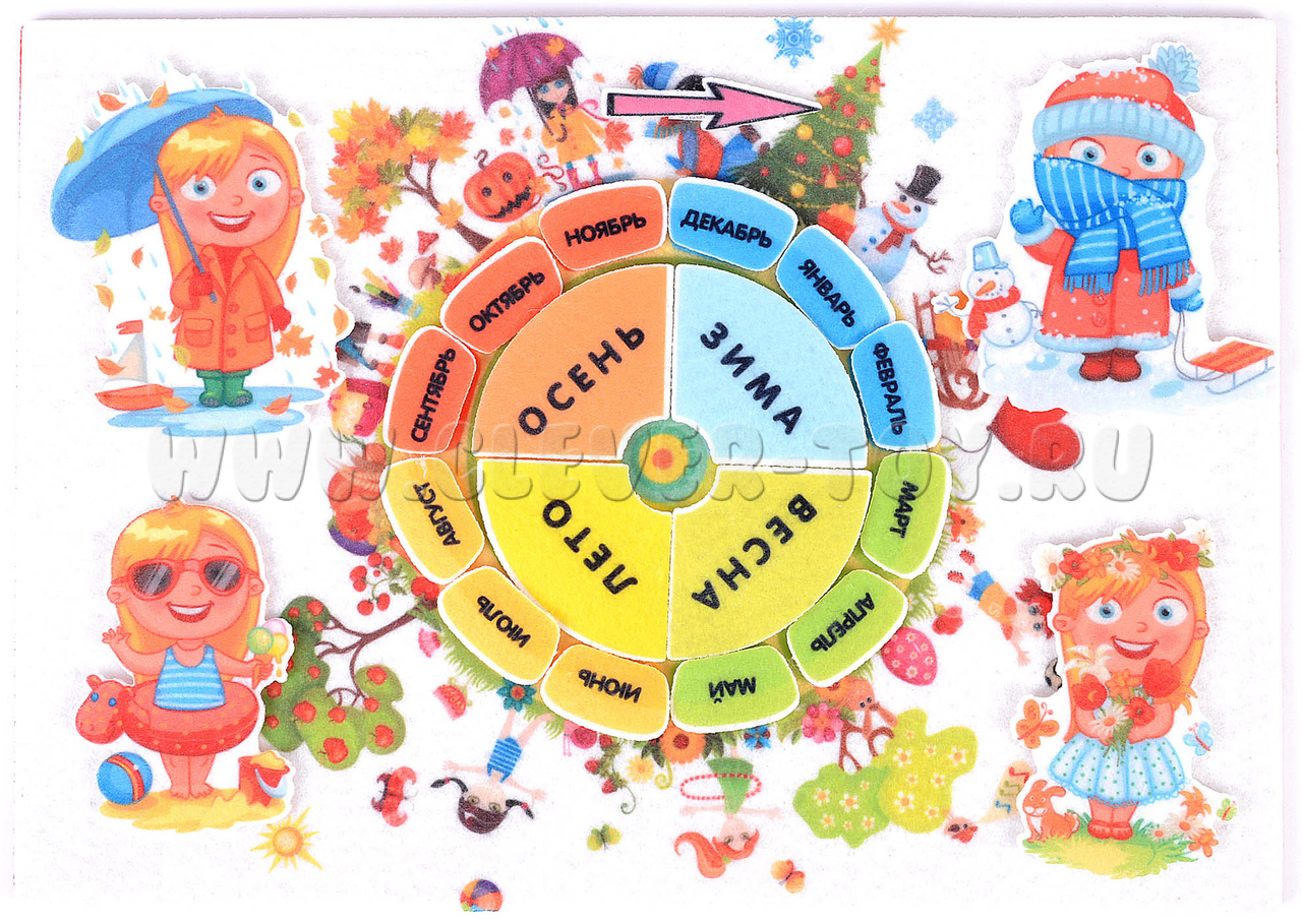 • тематическое игровое поле, на котором изображен круг-год, разделенный на 4 части, внутри которого вращается стрелка и может указывать на какой-то месяц;