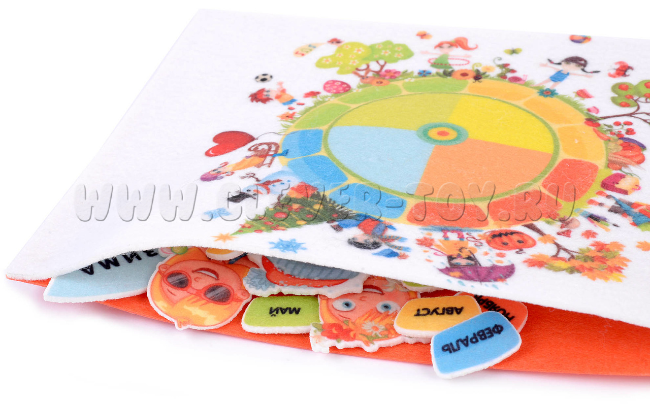 • фигурки с надписями – 12 шт. для каждого месяца и 4 шт. со временами года: лето, осень, зима, весна; надписи сделаны чёткими печатными буквами, каждое время года имеет свой узнаваемый цвет для удобства группировки;