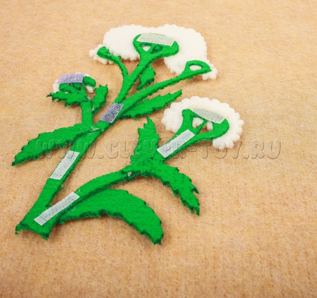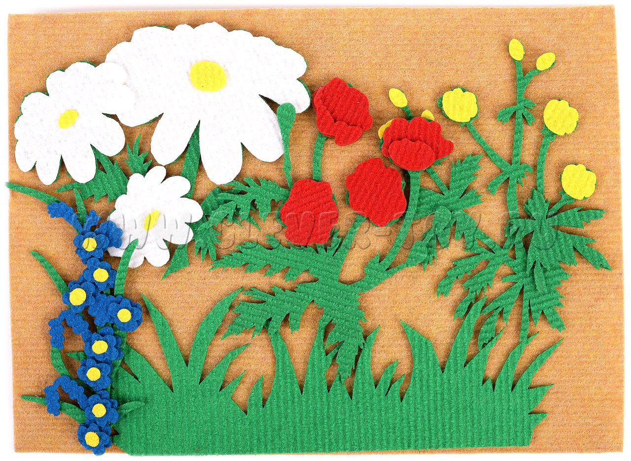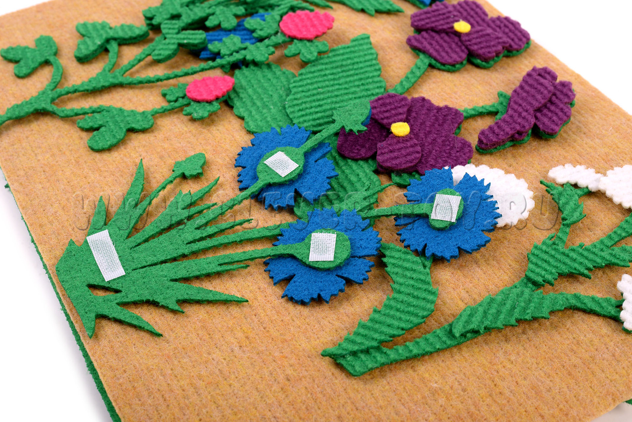 • 8 разнообразных видов луговых цветов, в том числе: мак, колокольчик, ромашка, василёк, лютики, фиалки вместе со стеблями, листьями и травой;