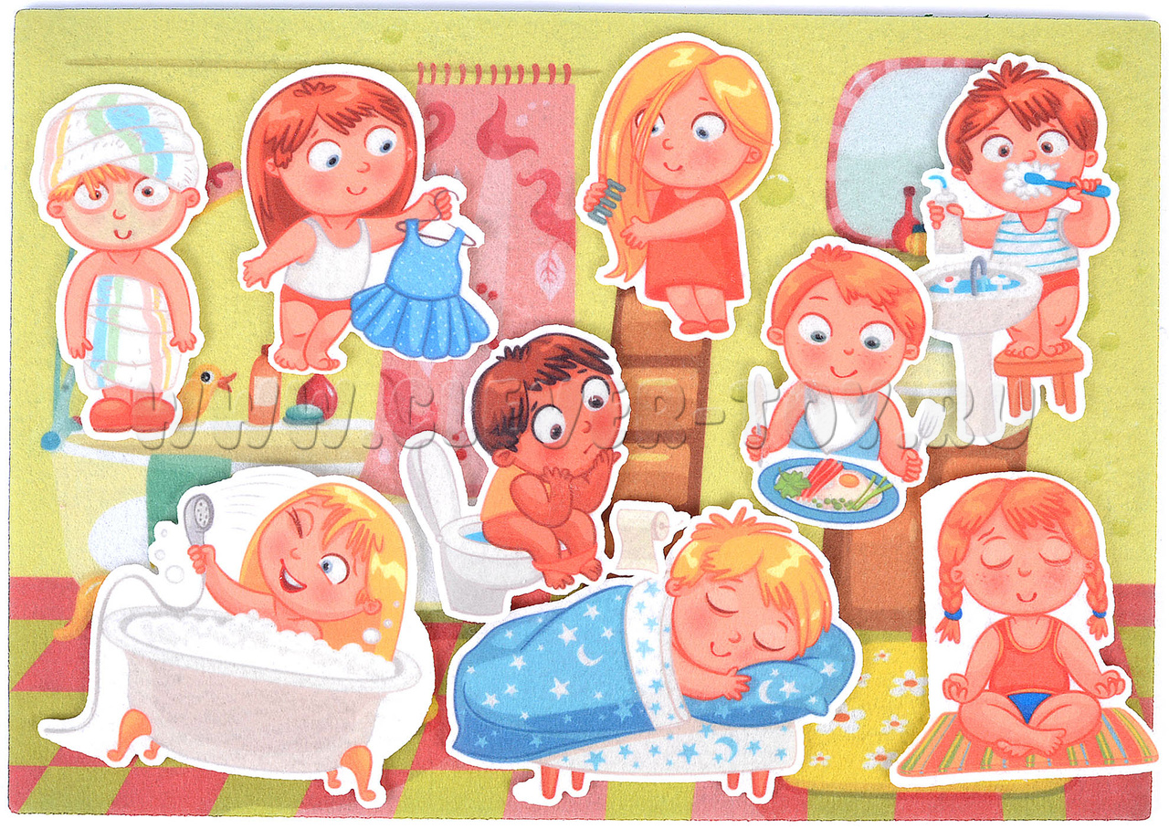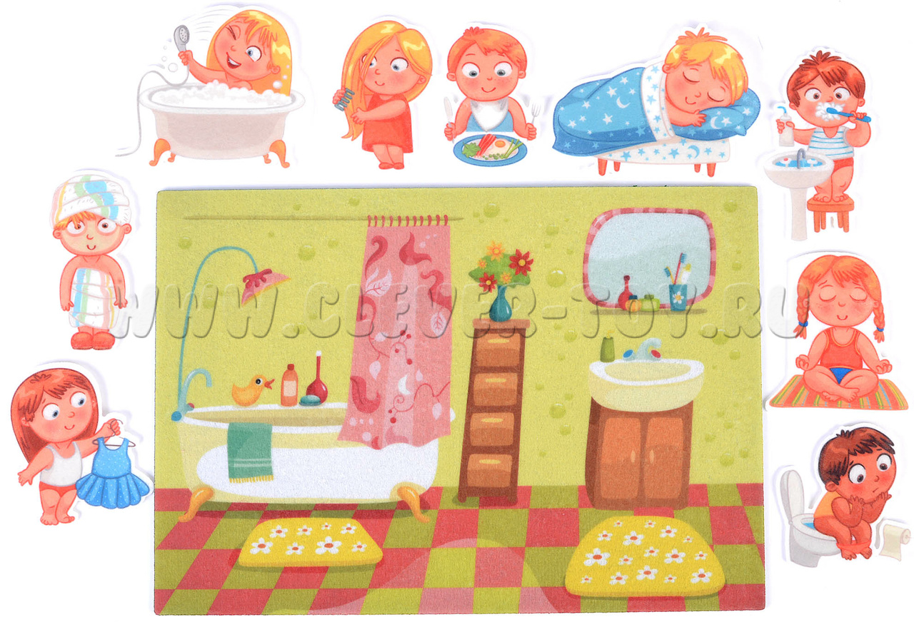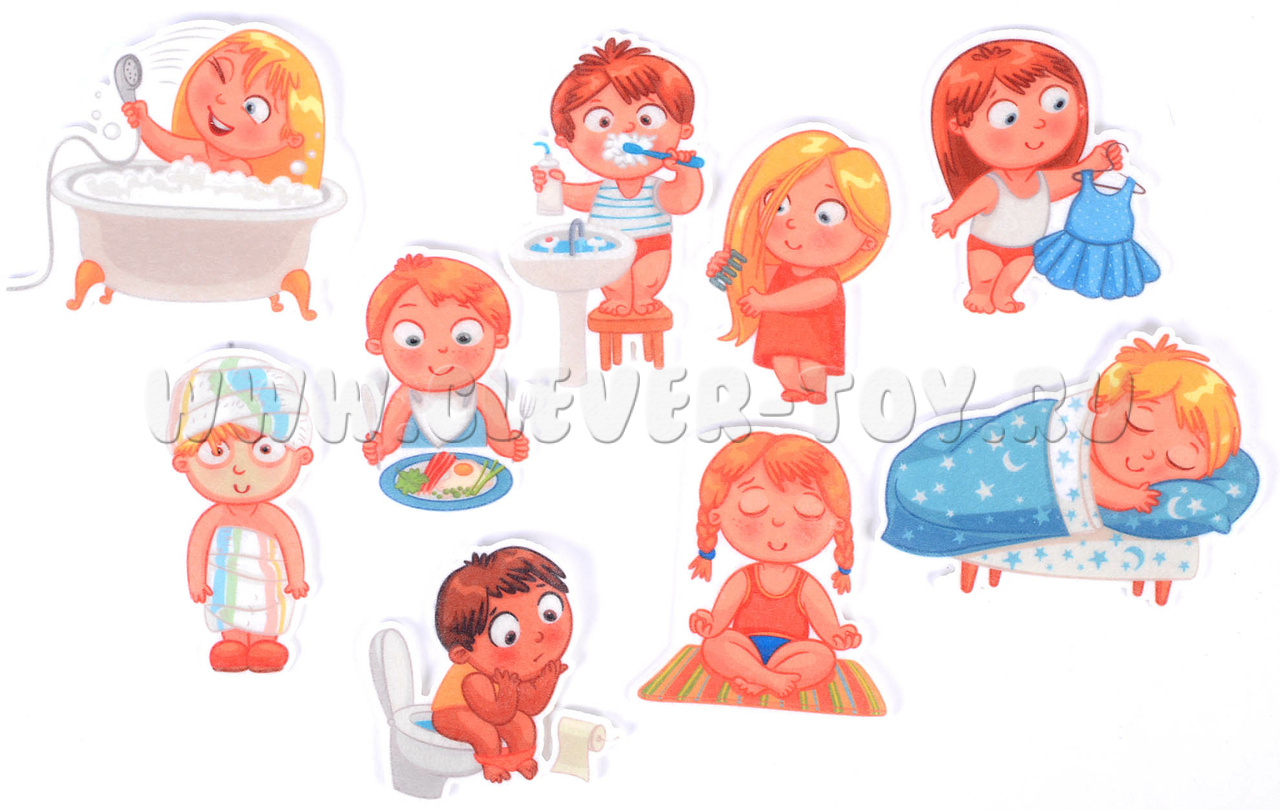 • 9 фигурок: ребёнок, сидящий на горшке, ребёнок, который чистит зубы, кушает, занимается йогой, расчёсывается, спит, одевается, ребёнка, принимающего ванную, ребёнка, закутанного в полотенце после купания;