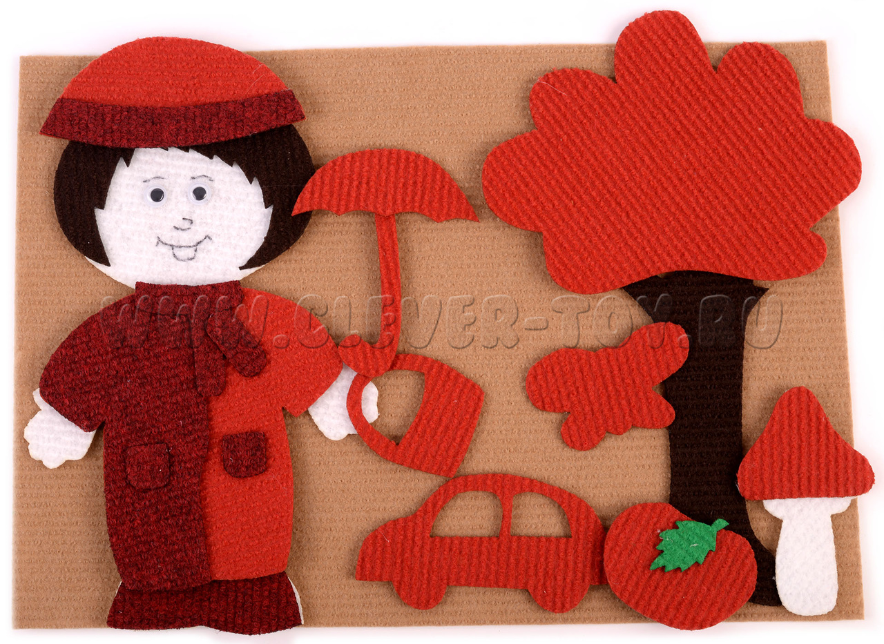 - одежда, аксессуары и атрибуты осени (красный): шапка, комбинезон, ботинки, крона дерева, машинка, бабочка, зонт, корзинка, гриб, яблоко;