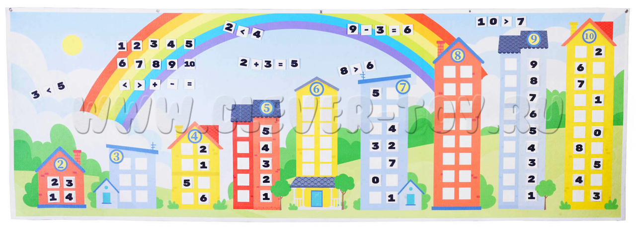 Большое панно с яркими разноцветными домиками для цифр и математических знаков поможет:
