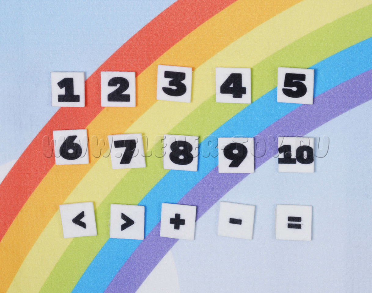 • большое игровое поле-панно, на котором изображены в порядке возрастания 9 пронумерованных разноцветных домиков для цифр и знаков, радуга, облака, солнце;