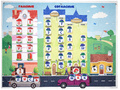 В комплекте вы найдёте красочное панно размером 60×80 см с изображением трёх домиков в городе букв. Также есть игровые элементы в форме кружочков с красными и синими буквами, игровые элементы в виде машин и автобуса, а также фигурки дидактических картинок.
