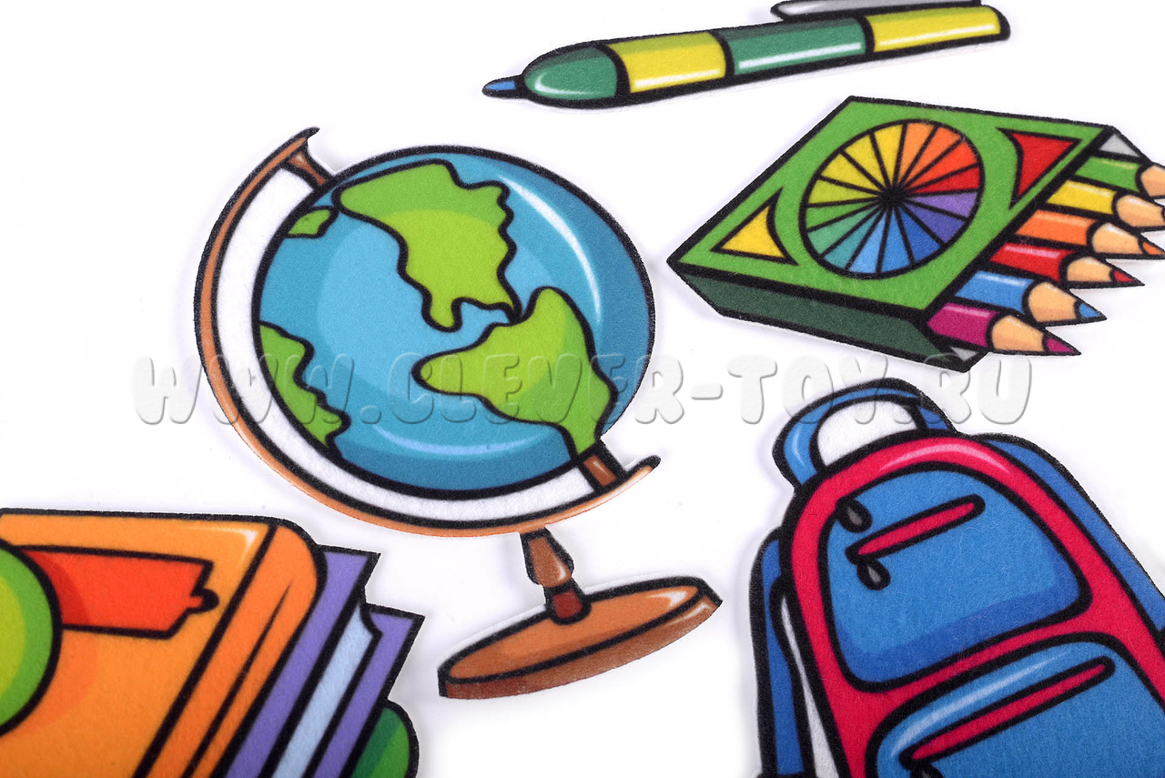 В комплекте 11 фигурок с изображениями школьных принадлежностей на липучках. Размеры фигурок: от 1,5×11 см до 9×12,5 см. Материал: фетр.