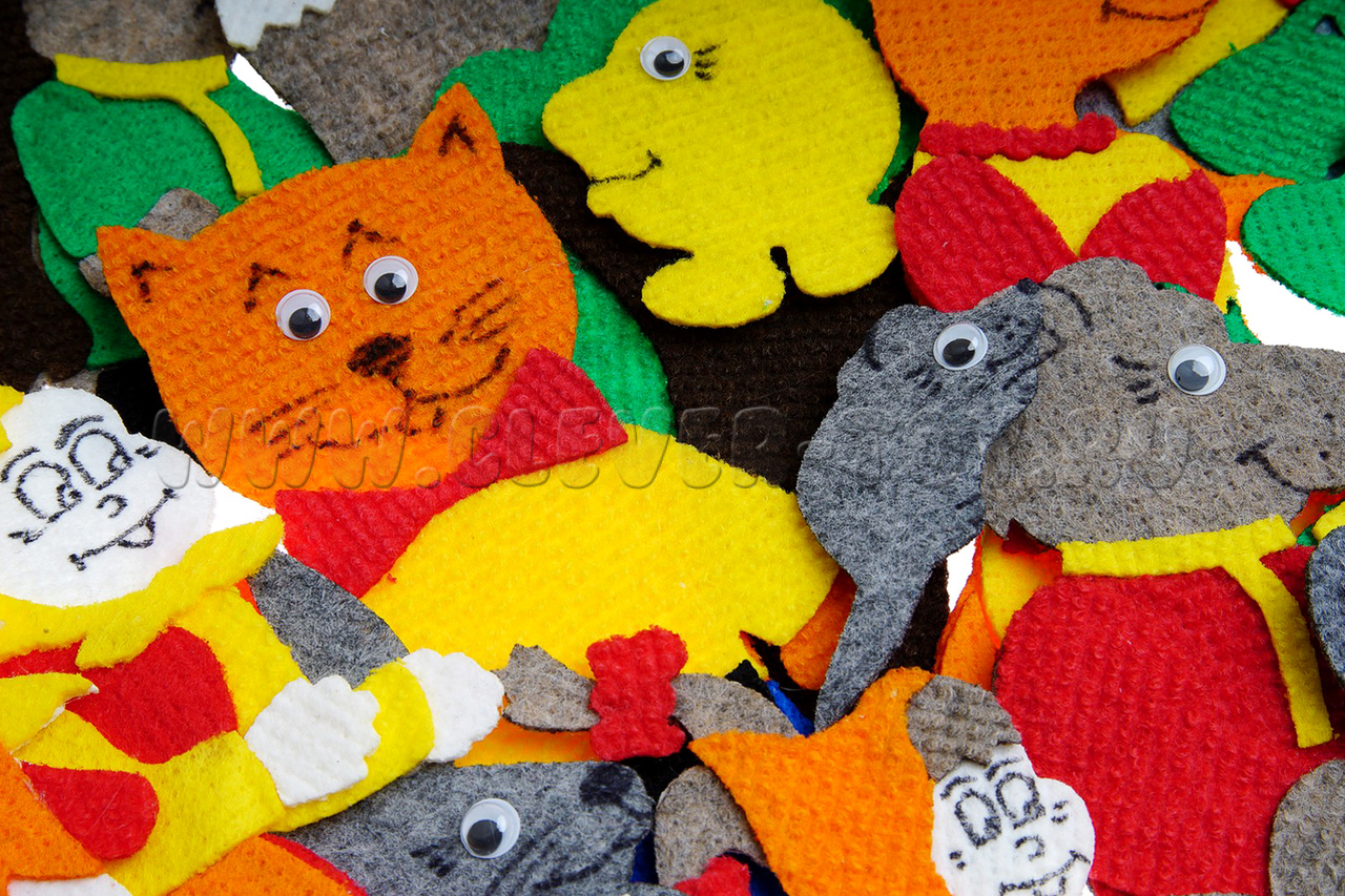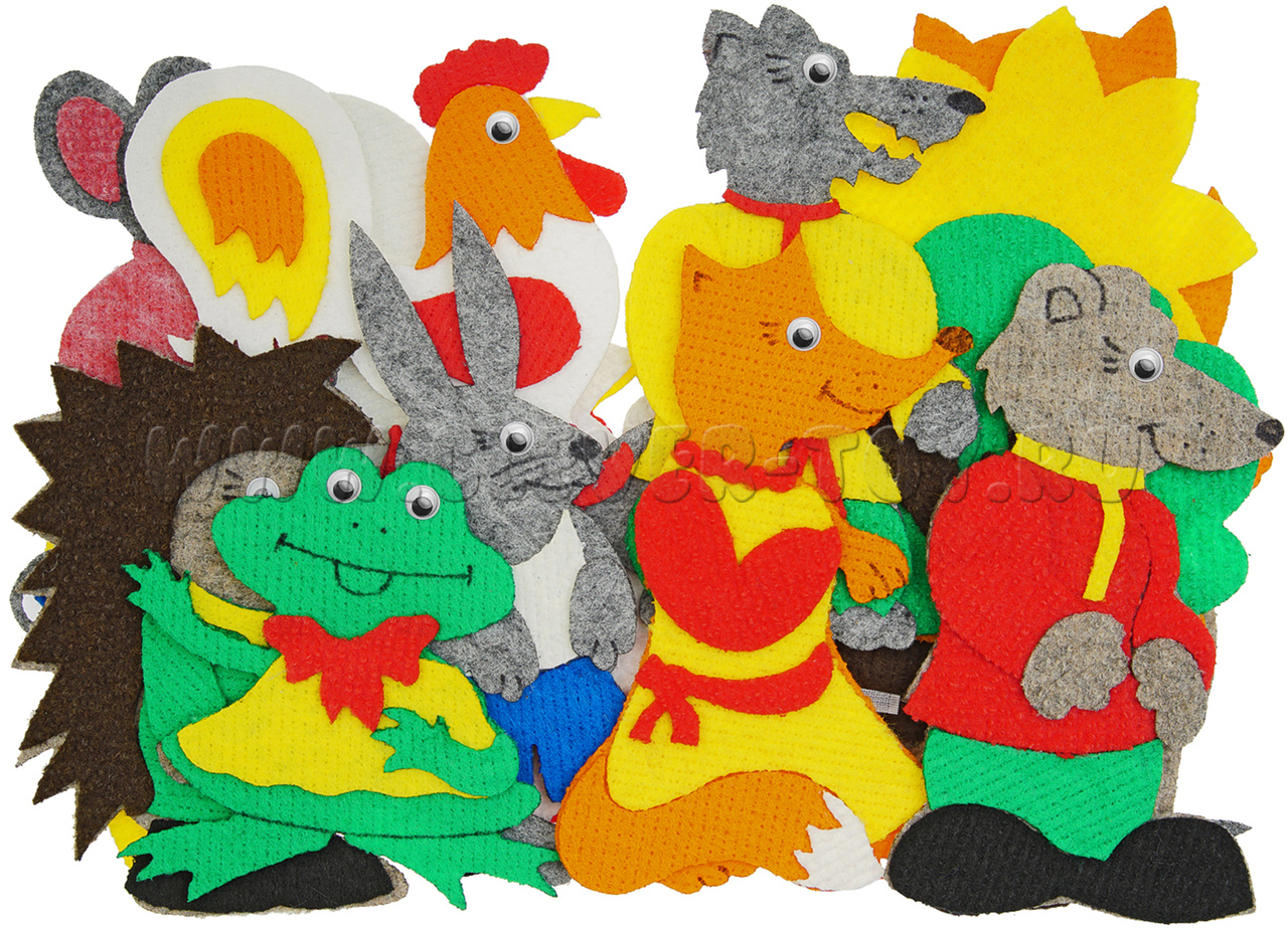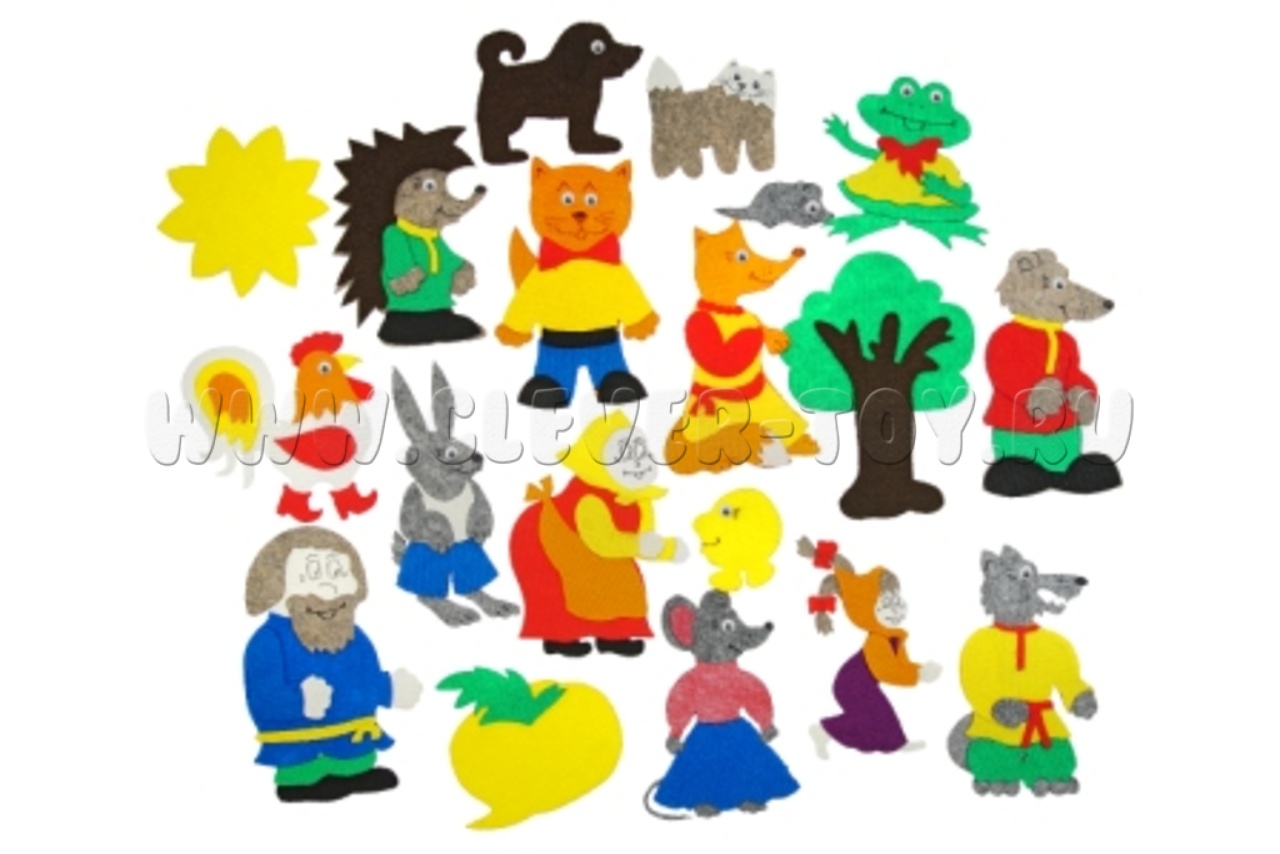 • всех персонажей из 5 сказок: дед, бабка, внучка, мышка, кошка, собачка, кот, заяц, ёжик, лягушка, лиса, волк, петух, колобок, медведь, мышь;