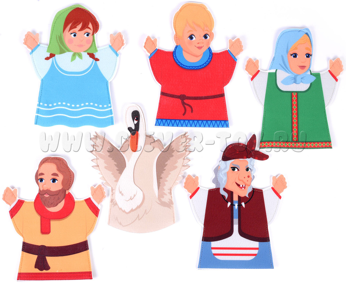 В наборе фигурки девочки, мальчика, отца, матери, Бабы Яги и лебедя. Средний размер фигурок 245*200 мм.