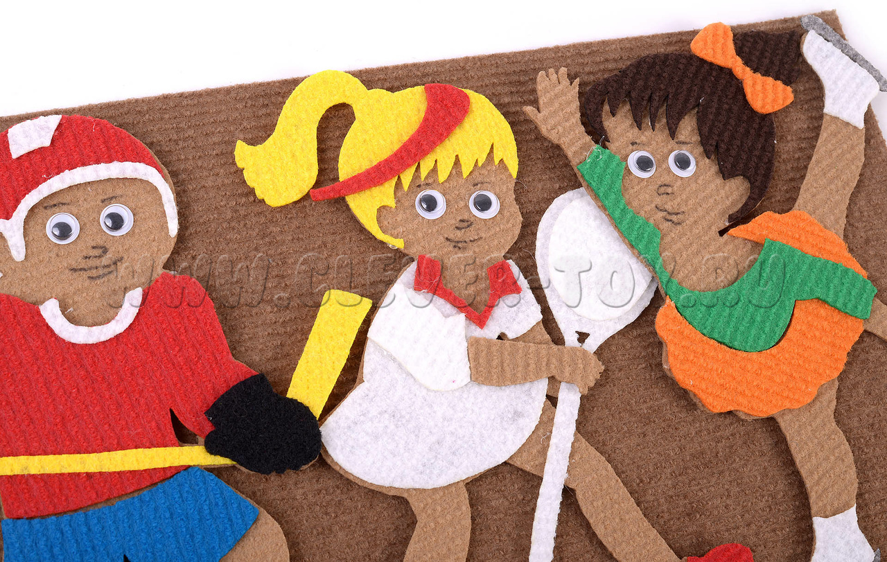 Многоразовая аппликация для плоскостного конструирования посвящена самым популярным мировым видам спорта: хоккею, фигурному катанию, футболу, тяжёлой атлетике, хоккею, лыжному спорту, теннису.