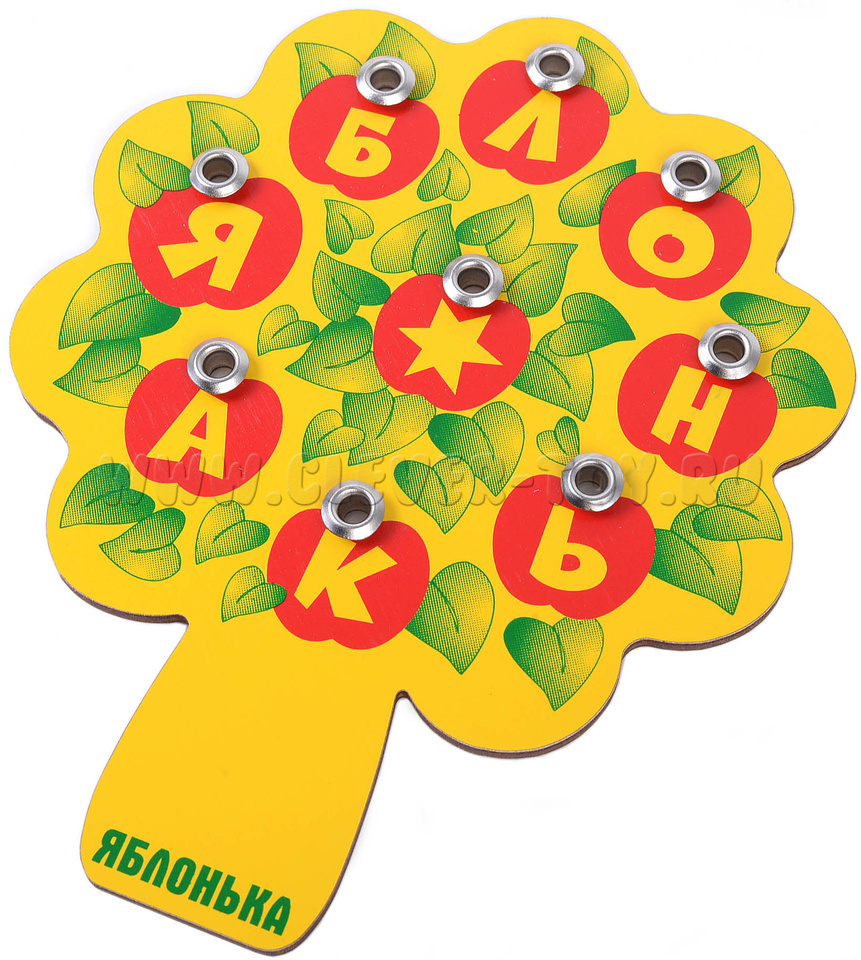 Ребенок продевает шнурок в отверстие, затем закручивает его вокруг последующих букв, и таким образом составляет различные слова. Символ "звездочки" означает любую букву. Начало слова Яблонька. Яблоко с буквой Я больше других яблок.