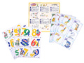 1. Игровые карточки – 24 шт. У каждой цифры на карточке – 3 отличительные признака: цвет, размер и положение. Числовая ось – от 0 до 10 – служит подсказкой для поиска заданной цифры.