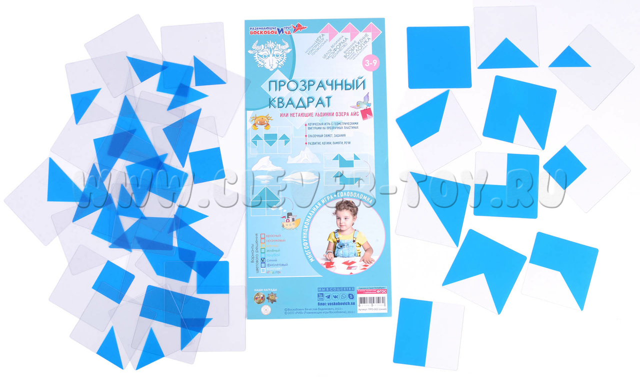 Синий Прозрачный квадрат от фирмы «Развивающие игры Воскобовича» - один из серии «Прозрачных квадратов» разных цветов (красный, жёлтый, зелёный). Пособия можно использовать по отдельности, а также комбинировать все 4 цвета квадратов, смешивая цвета и получая новые сочетания: оранжевый, фиолетовый, коричневый и т.д.