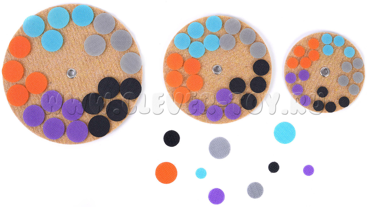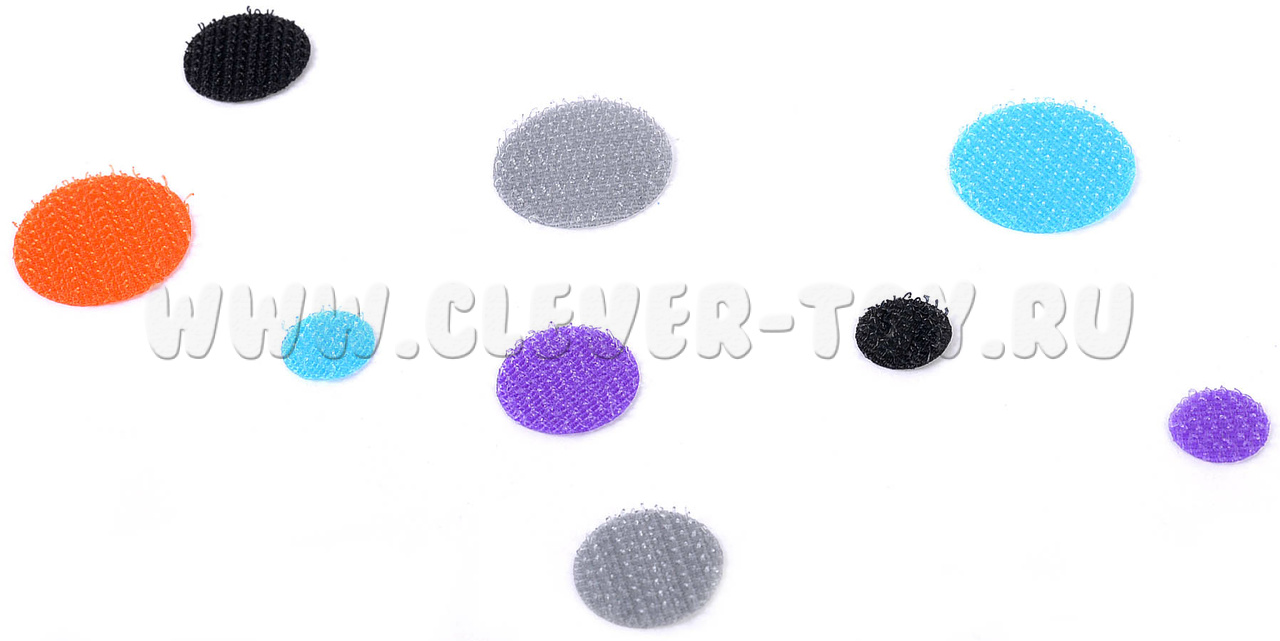 • кружки из контактной ленты 5 цветов (оранжевый, голубой, фиолетовый, чёрный, серый), 3-х размеров (диаметр 10,15,20 мм) – 75 шт.,