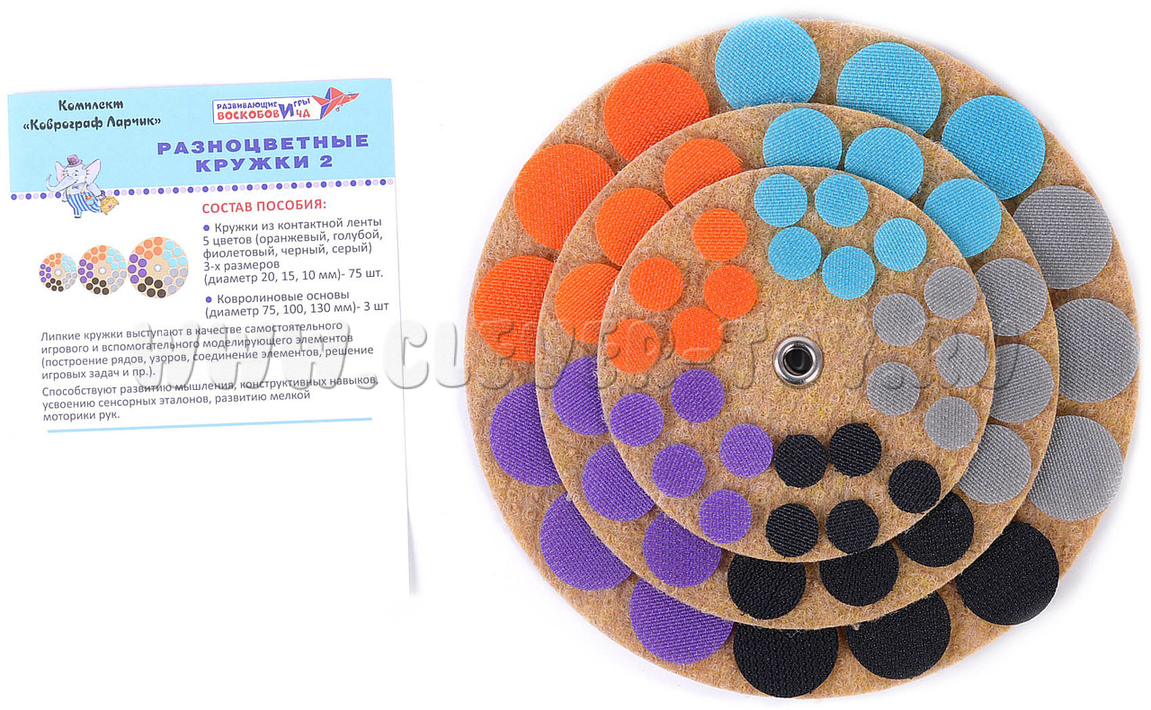 С помощью методического пособия к набору «Коврограф Ларчик» и пособия «Разноцветные кружки» родители, воспитатели и дети смогут узнать о механизме проведения множества весёлых развивающих игр и занятий. К примеру, кружки могут выступать в качестве: