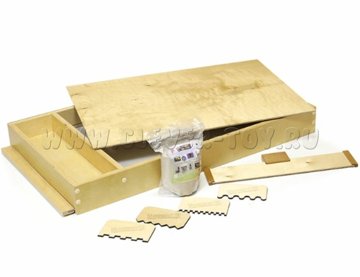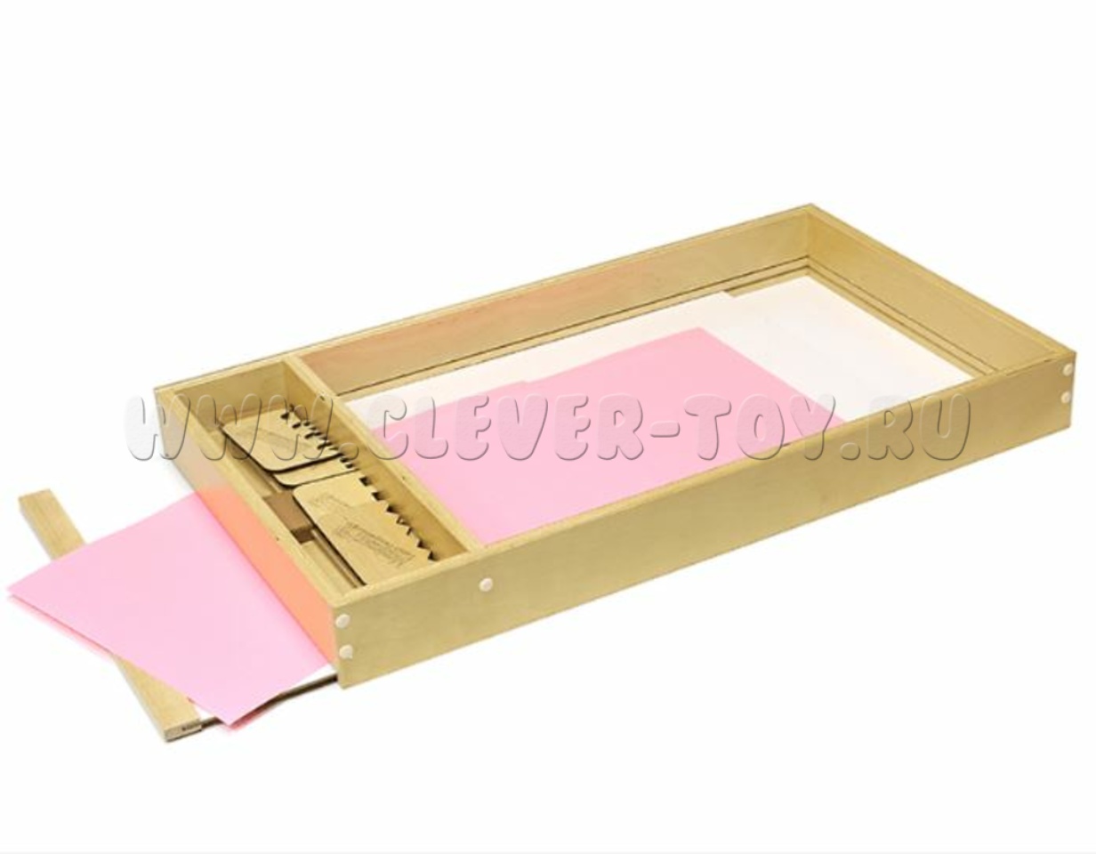 Большой деревянный ящик с прозрачным выдвижным дном. Прозрачное дно позволяет менять фон. Рисуем на песке или манке, используем при этом предметы, оставляющие следы.