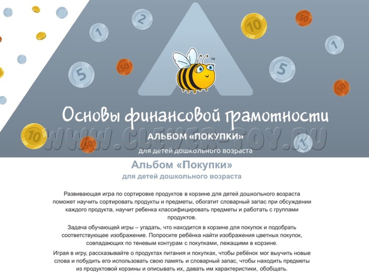 Набор игр и пособий по основам финансовой грамотности обеспечивает знакомство с основными понятиями в сфере финансов и дает возможность как для самостоятельной игры, так и для совместных занятий детей и взрослых, закладывает основу практического применения полученных в игре знаний элементарной финансовой грамотности.