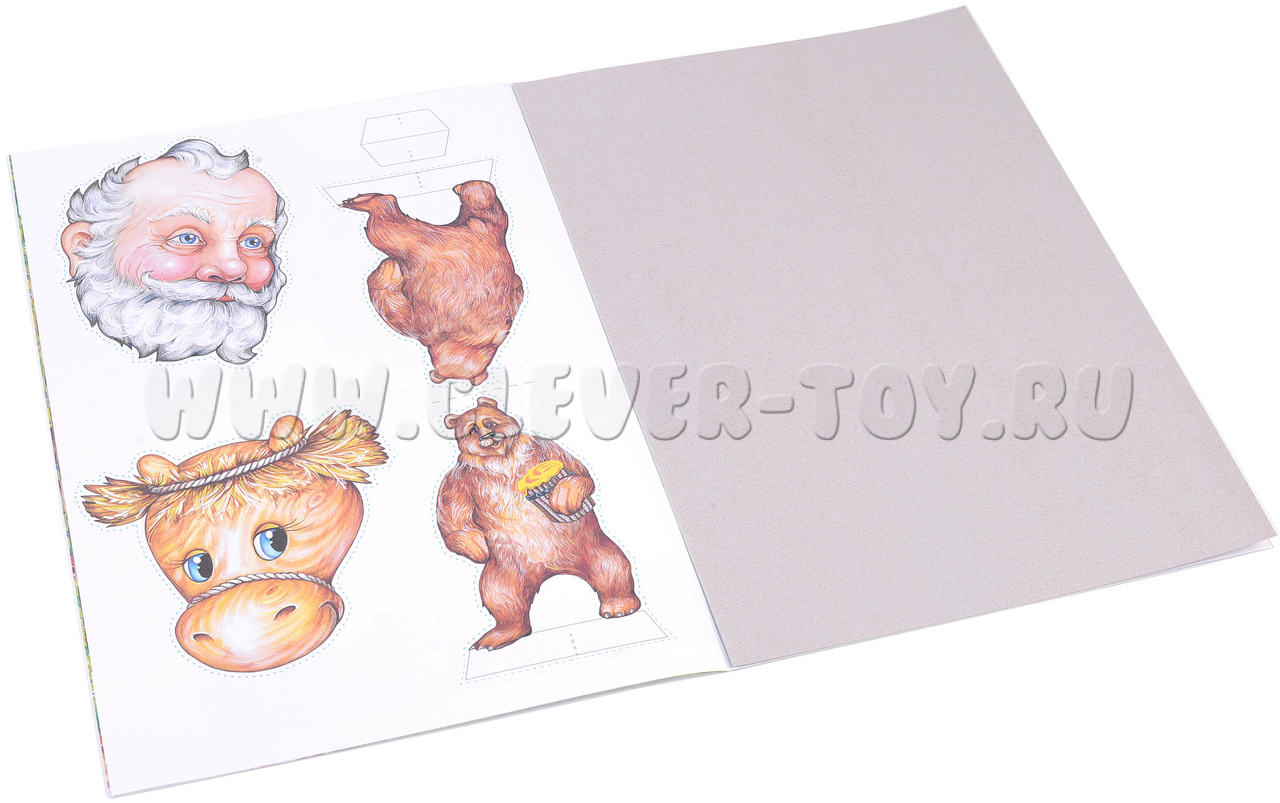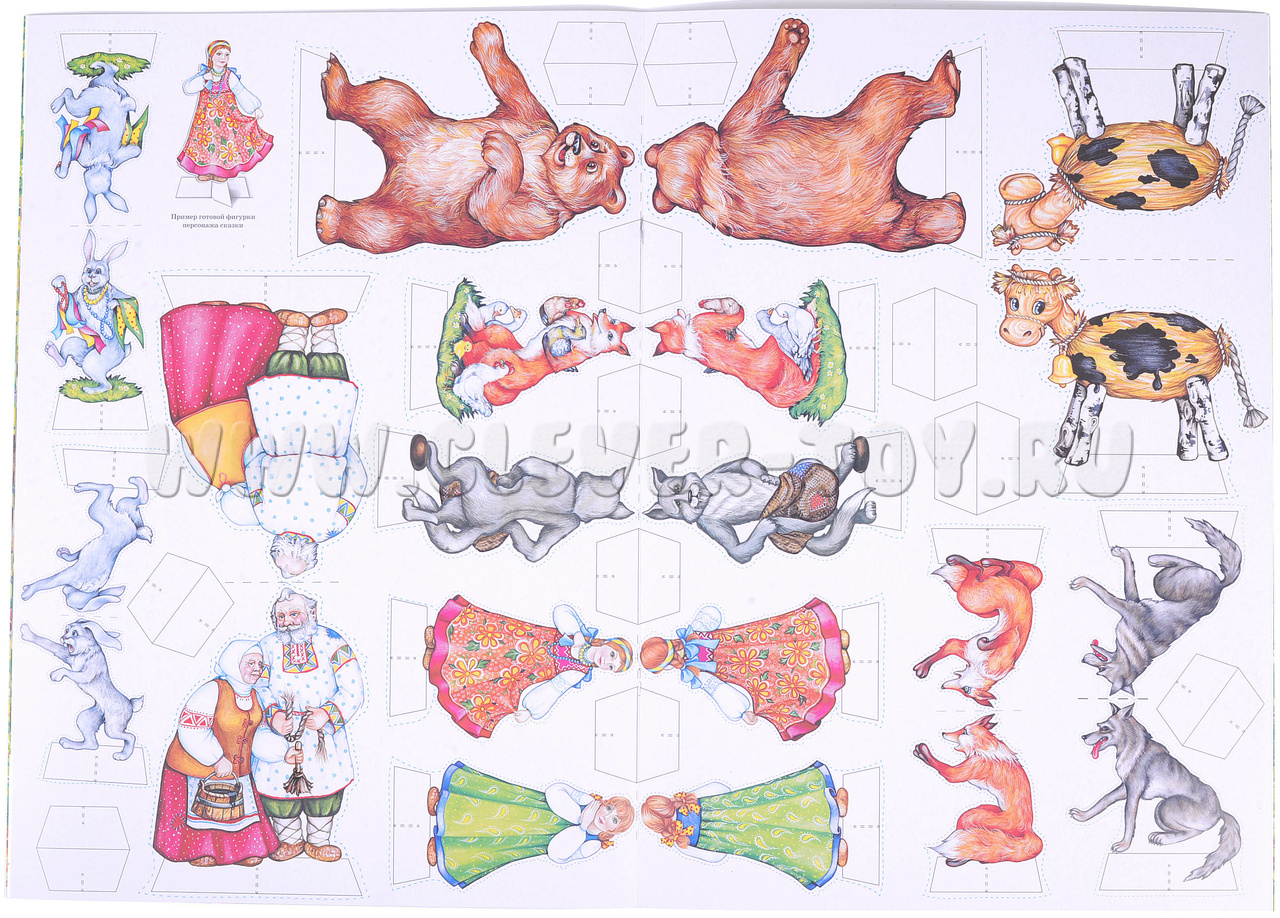 • Действующих персонажей выполненных из плотного картона, созданных для показа настольного театра. Средний размер персонажей, составляет 9 см. (Задача ребенка состоит в том, что нужно вырезать по пунктирным линиям 10 персонажей избушку, лес и склеить их);