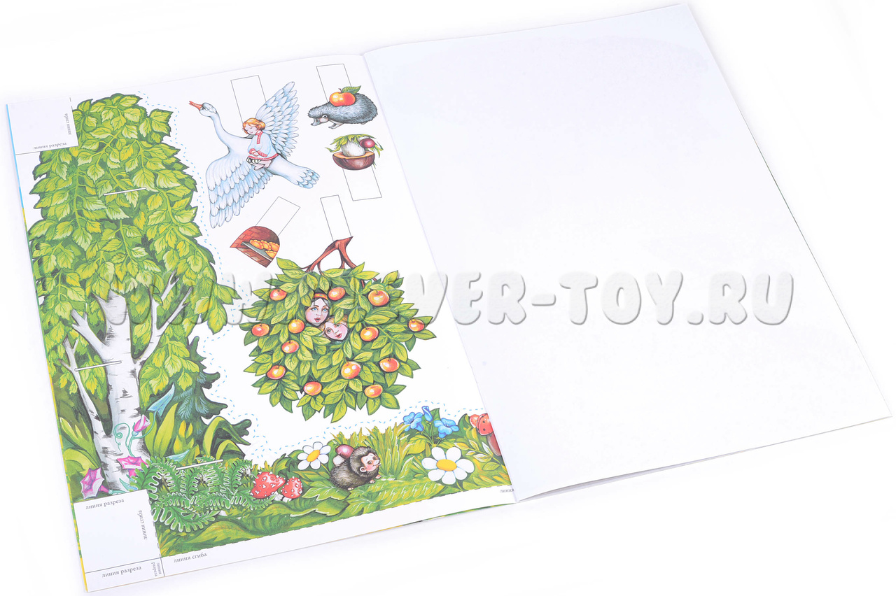 • Действующих персонажей выполненных из плотного картона, созданных для показа настольного театра. Средний размер персонажей, составляет 12 см. (Задача ребенка состоит в том, что нужно вырезать по пунктирным линиям 7 персонажей печку, яблоню, лес, избушку и склеить их);