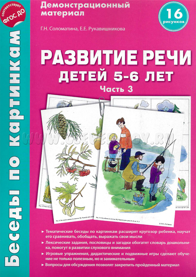 Методическое пособие "Занятия по развитию речи детей 5-6 лет" соответствует содержанию наглядного пособия, дополняет и расширяет его (пособие приобретается отдельно).