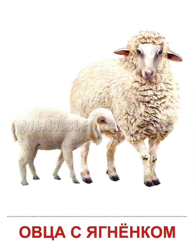 Состав комплекта (16 карточек): Баран, лошадь, жеребёнок, коза, козлёнок, осёл, корова, телёнок, кошка, котёнок, кролик, свинья, поросёнок, собака, щенок, овца с ягненком.