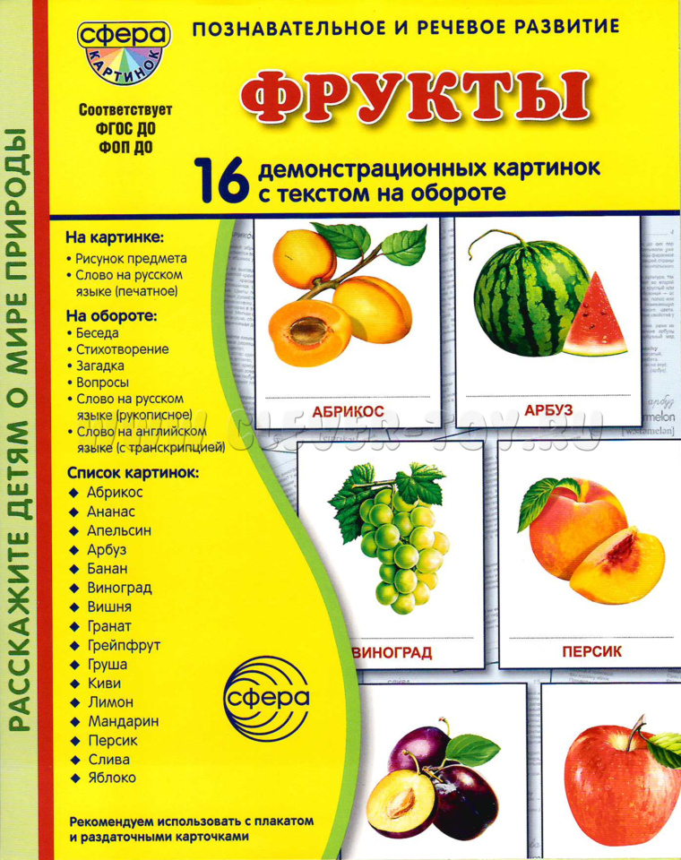 Комплект "Фрукты" состоит из 16 цветных демонстрационных карточек (картинок). Откройте удивительный мир фруктов вместе с нашими демонстрационными карточками! Узнайте, как выглядят разные фрукты, и обсудите их с ребёнком. Узнайте, когда собирают урожай, и расскажите малышу о пользе каждого фрукта. Удивите его интересными фактами из истории фруктов и поделитесь своими знаниями. Пусть ваш ребёнок узнает больше о мире фруктов и полюбит их ещё сильнее!