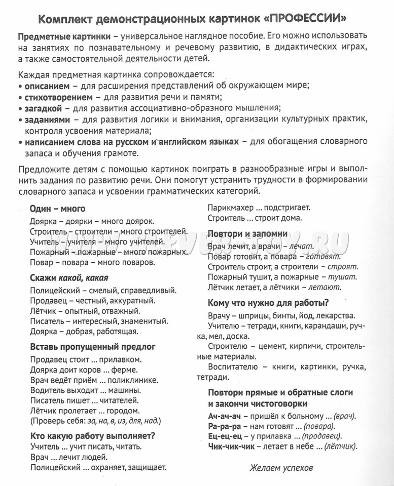 Набор карточек "Профессии" состоит из бесед, стихотворений, загадок и вопросов по теме. Комплект включает 16 цветных демонстрационных картинок с текстом на обороте, названия тем имеют перевод на английский язык.