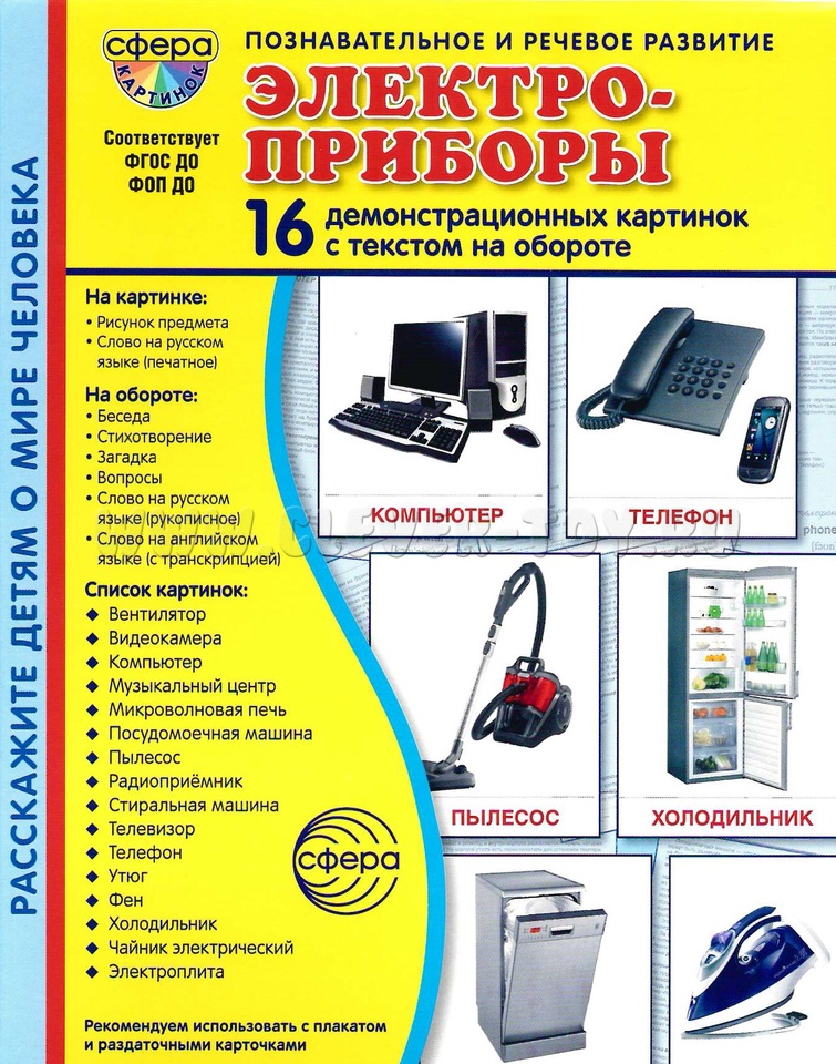 Комплект "Электроприборы" состоит из 16 цветных демонстрационных карточек (картинок) и адресован детям и их родителям. Откройте удивительный мир электроприборов вместе с нашими демонстрационными карточками для детей!