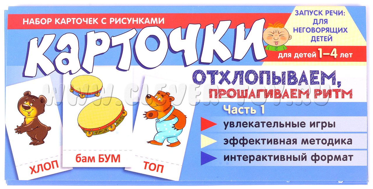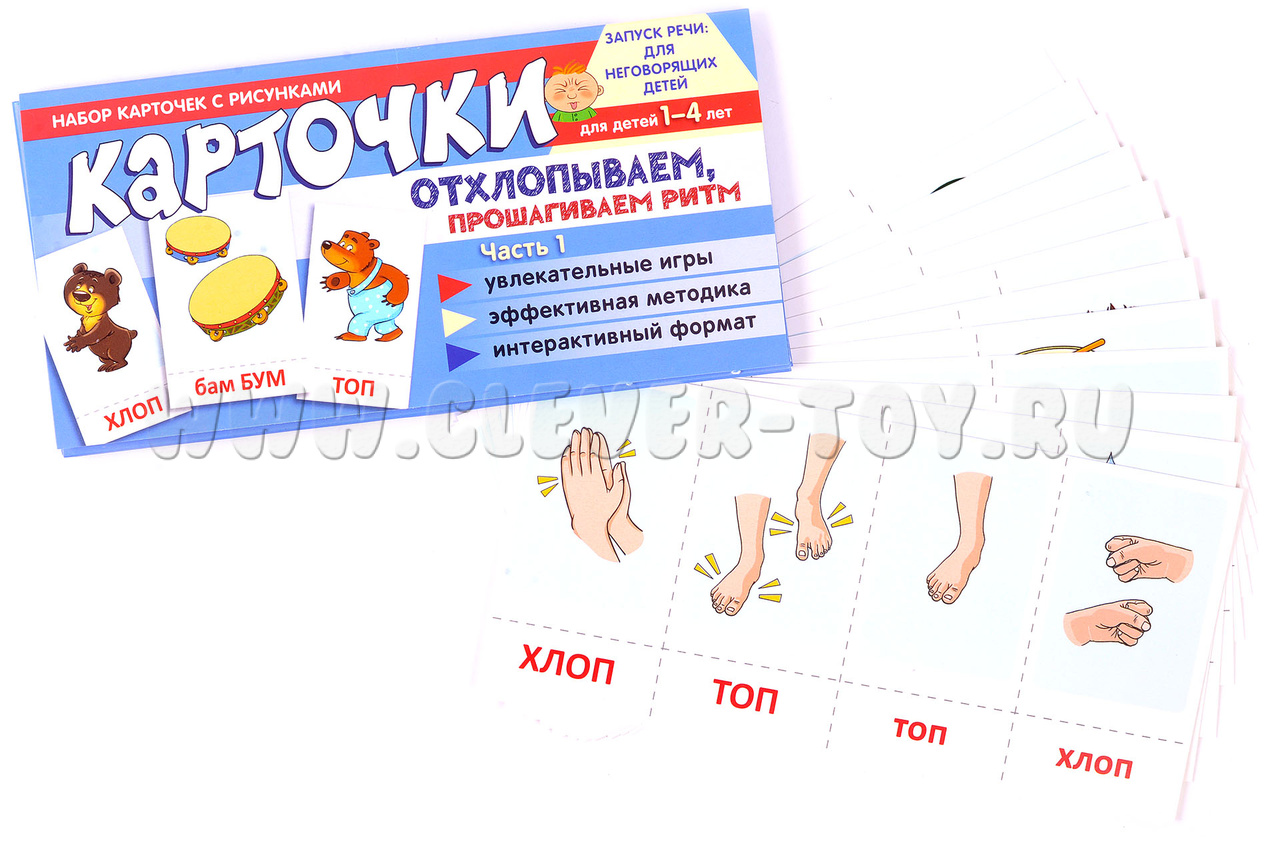 Комплект "Отхлопываем, прошагиваем ритм. Часть 1" - это 12 листов, в которые входят 78 карточек и 5 увлекательных игр. Он разработан для детей от 1 года до 4 лет, чтобы помочь им развивать простой ритмический рисунок речи.