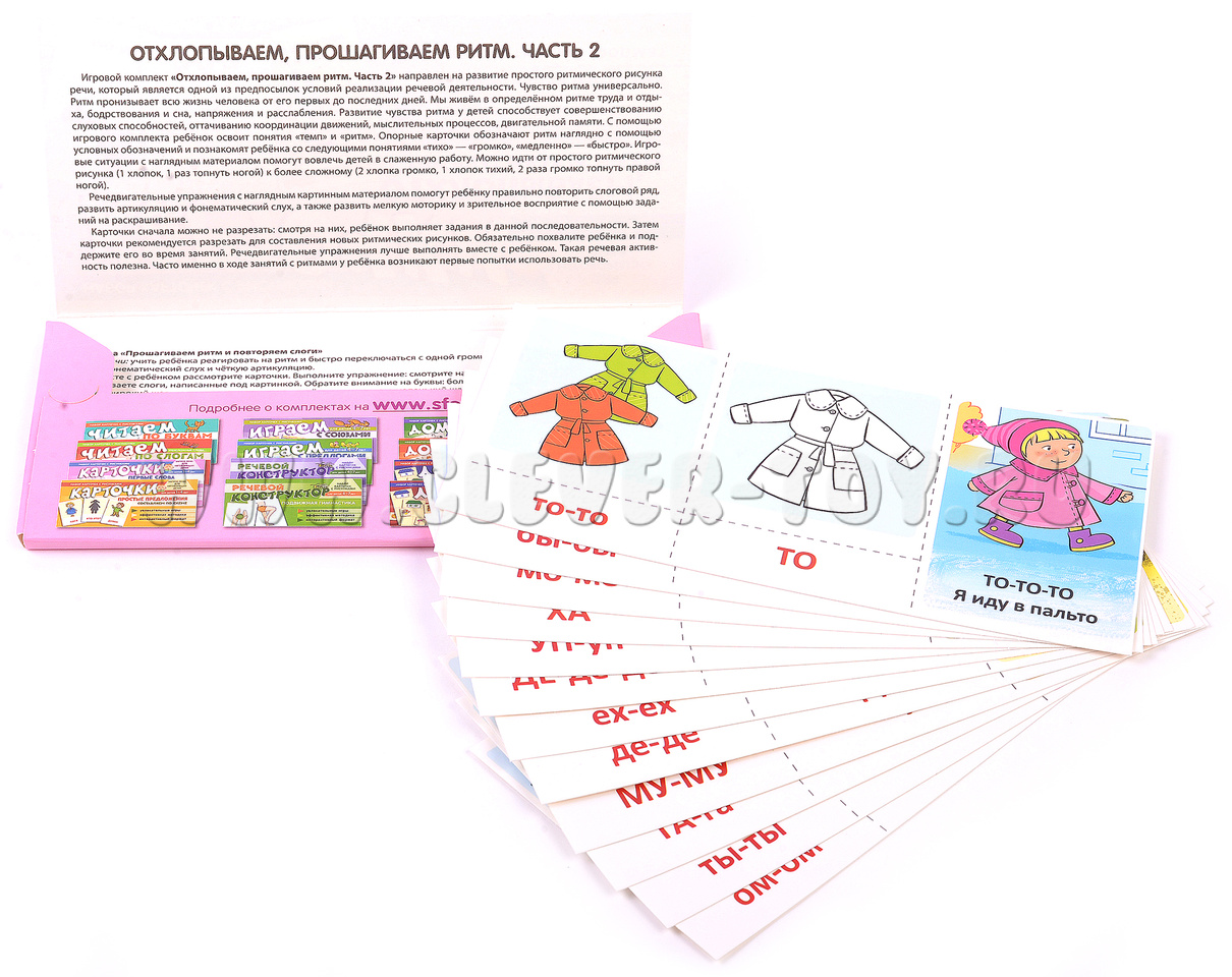 Набор "Отхлопываем, прошагиваем ритм. Часть 2" - это 12 листов, на которых собраны 60 карточек и 4 увлекательные игры. Он предназначен для детей от 1 года до 4 лет.