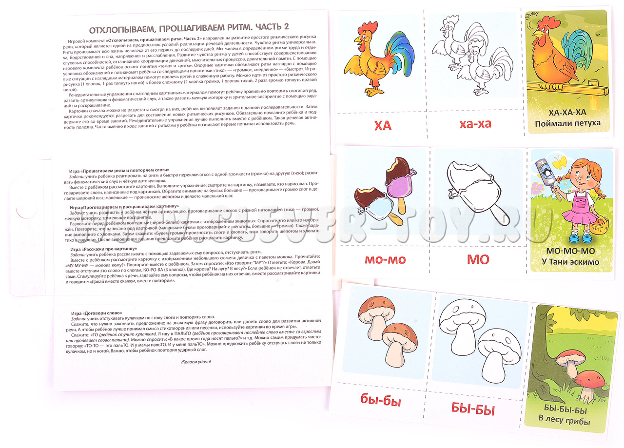 Задания в этом наборе разработаны в игровой форме и направлены на то, чтобы помочь неговорящему ребёнку развить простой ритмический рисунок речи.