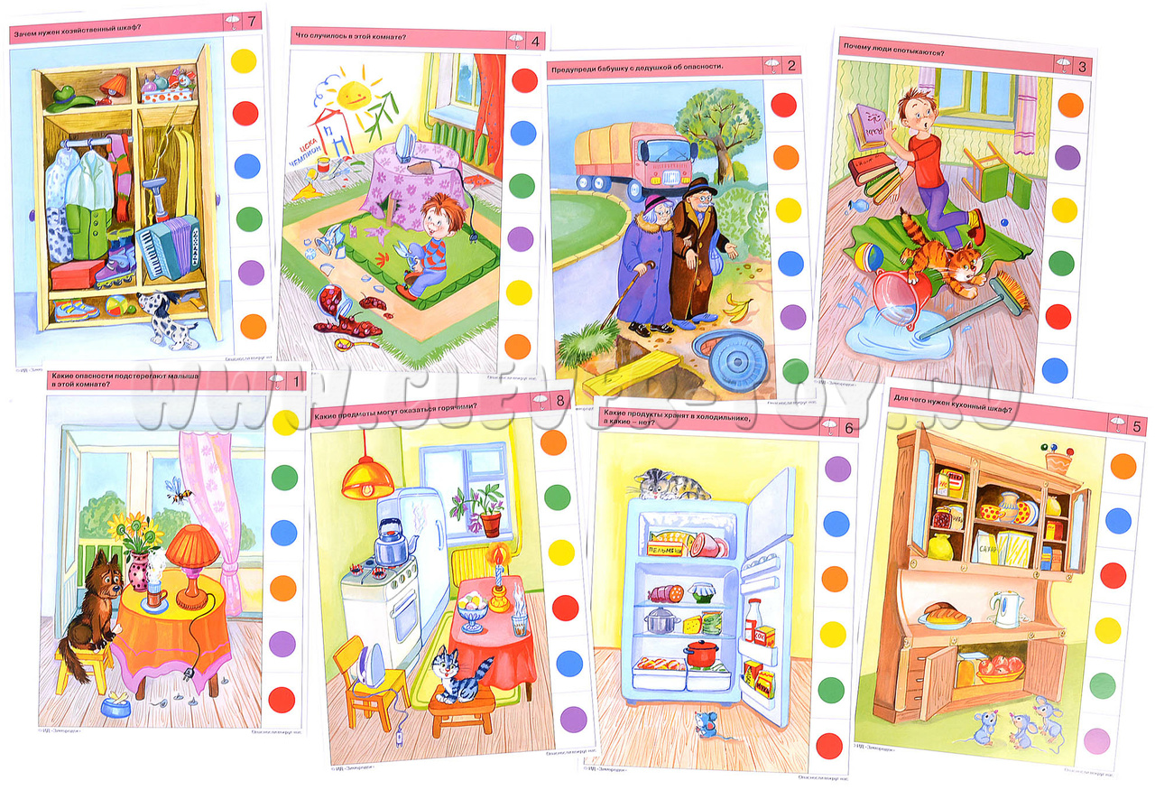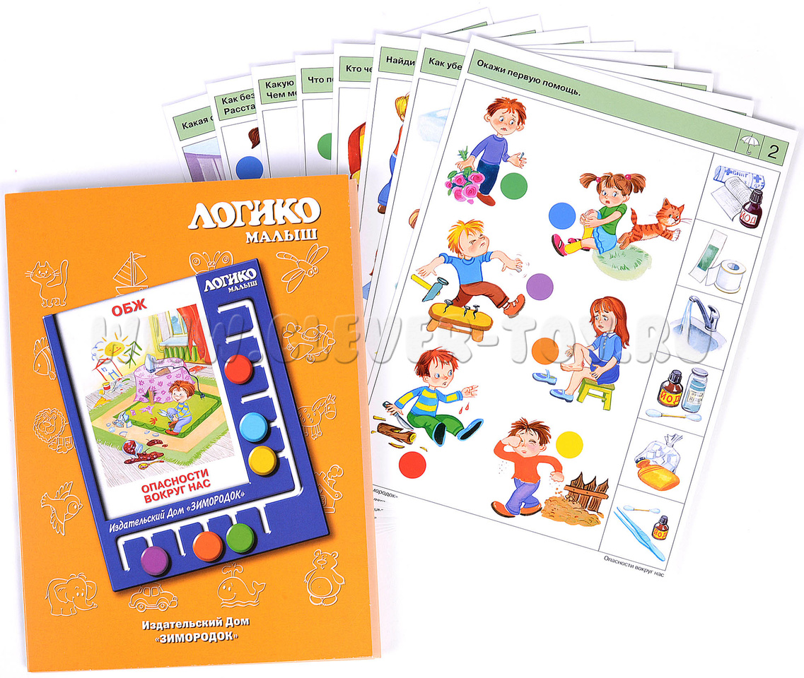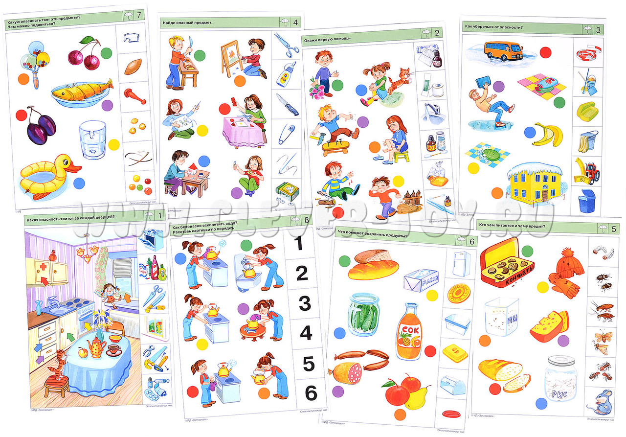 Задания комплекта направлены на обучение ребёнка предвосхищать (предупреждать) опасные ситуации и закреплять алгоритм действий, если все-таки произошёл несчастный случай или происшествие. В процессе решения заданий комплекта дети научатся анализировать возможную опасность, которую могут таить в себе повседневные, с виду безобидные предметы, или ситуации которые могут привести к нежелательным и опасным последствиям. Примеры заданий в карточках: 1б. Какие опасности подстерегают малыша в этой комнате? 2а. Окажи первую помощь. 2б. Предупреди бабушку с дедушкой об опасности. 4б. Что случилось в этой комнате? 7а. Какую опасность таят эти предметы?