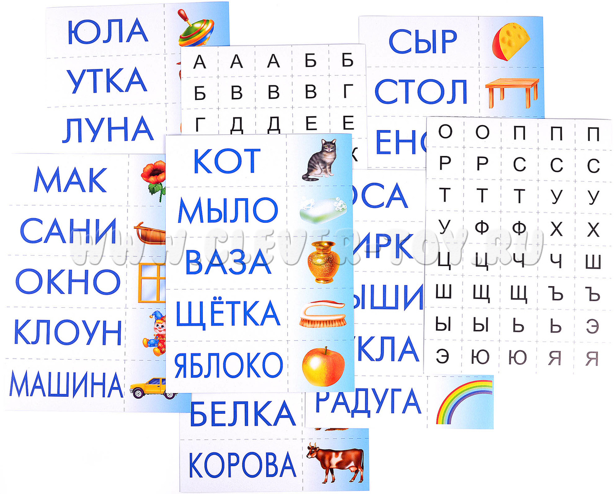 Количество: 6 листов с картинками и словами (по 5 на каждом, всего 30 картинок и 30 слов) и 2 листа с буквами (всего 80 карточек с буквами)